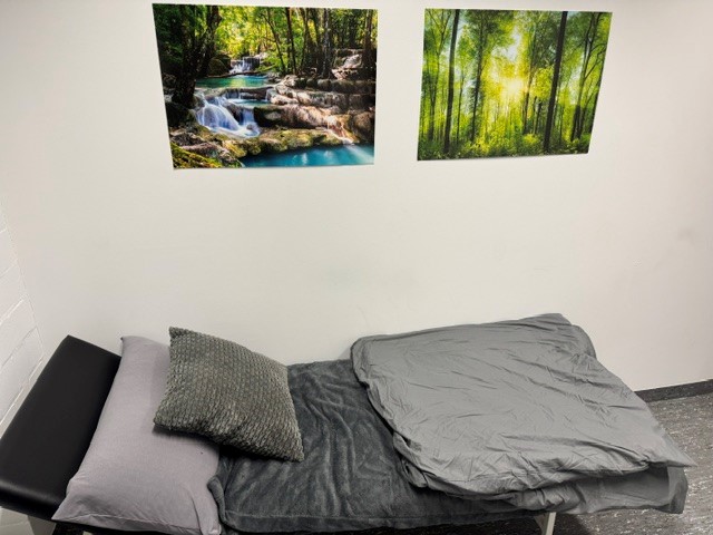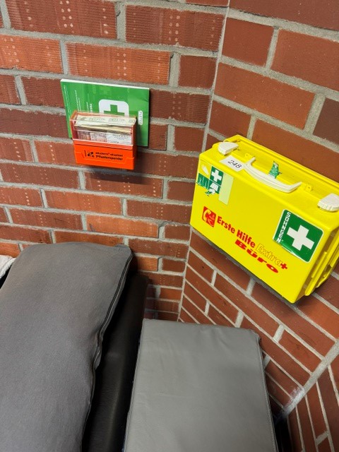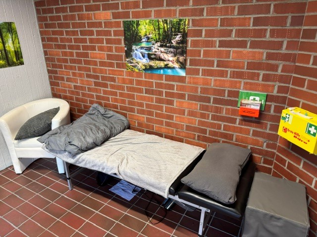 Erste-Hilfe-Kasten, Pflasterspender, Liege mit Kuscheldecke, Gewichtsdecke und Kissen, zwei Sessel, Schreibtisch mit Stuhl, Desinfektionsmittel, Steckdose