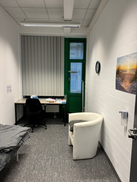 Liege, Kuscheldecke, Gewichtsdecke, Kissen, Schreibtisch, Steckdosenleiste, Papiertücher, geräuscharme Uhr, verstellbare und dimmbare Lampe, Sessel, Desinfektionsmittelspender