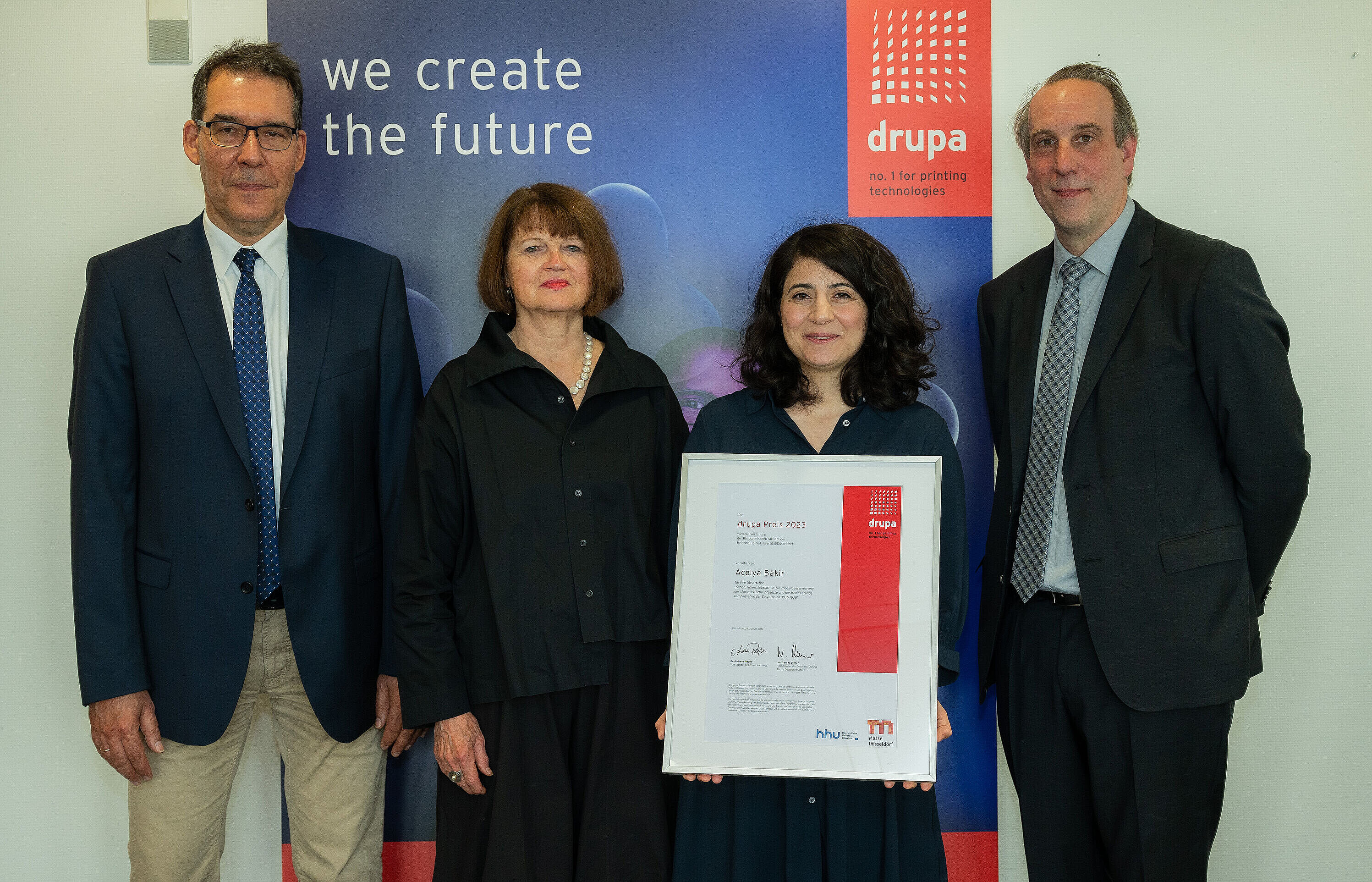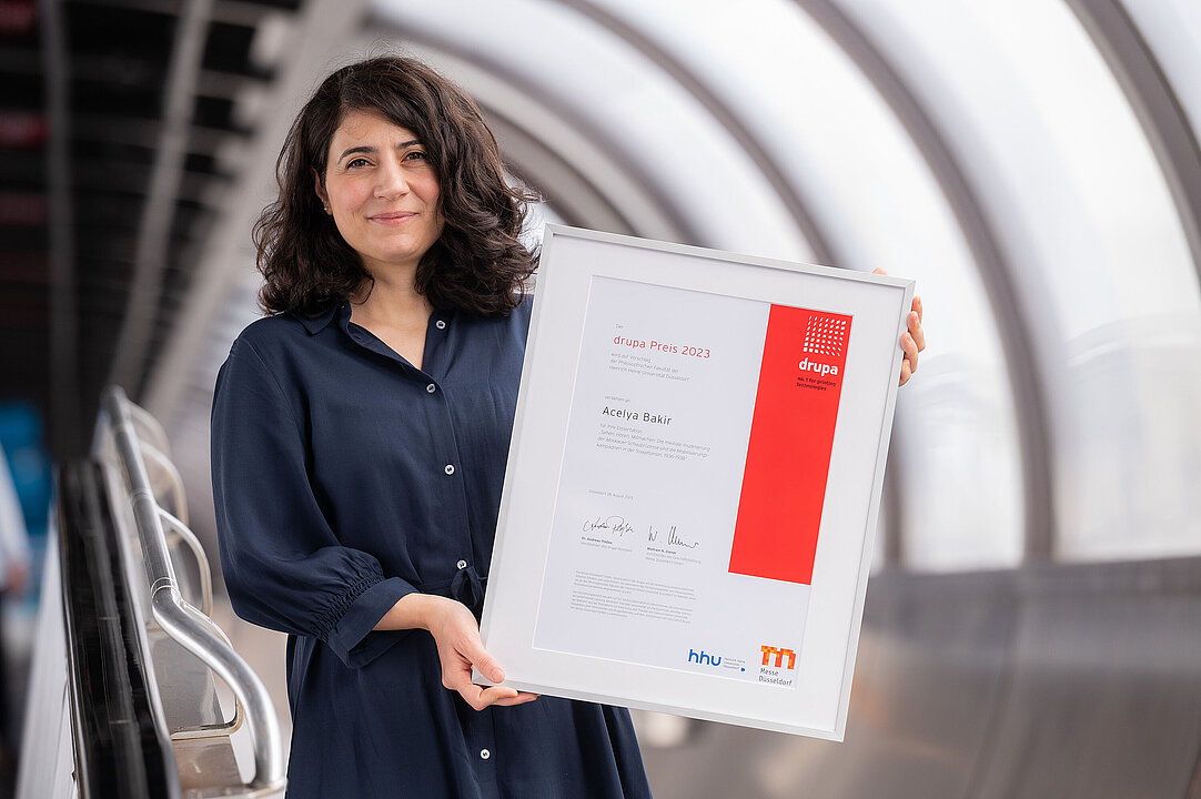 Der mit 6.000 Euro dotierte drupa Preis wurde von Wolfram N. Diener (Vorsitzender der Geschäftsführung der Messe Düsseldorf), Erhard Wienkamp (Geschäftsführer Messe Düsseldorf), Dr. Martin Goch (Kanzler der HHU) und Dr. Frank Meier (Studiendekan der Philosophischen Fakultät) in einer feierlichen Zeremonie am 28. August 2023 auf dem Gelände der Messe Düsseldorf überreicht. Dr. Andreas Pleßke (Vorstandssprecher von Koenig & Bauer und Vorsitzender des drupa Komitees) beglückwünschte die Preisträgerin in einer persönlichen Videobotschaft zu ihrer Leistung.
