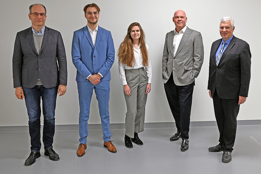 Verleihung des „Dr. Manfred-Jäger-Preis für die beste Masterarbeit am Institut für Organische Chemie und Makromolekulare Chemie im Bereich Polymere und Oligomere“ im Jahr 2023 an der HHU (v.l.): Prof. Dr. Constantin Czekelius, Damjan Trpkovski, Natascha Alexandra Hübel, Dr. Christian Jäger, und Prof. Dr. Thomas J. J. Müller. (Foto: HHU / Klaus Schaper)