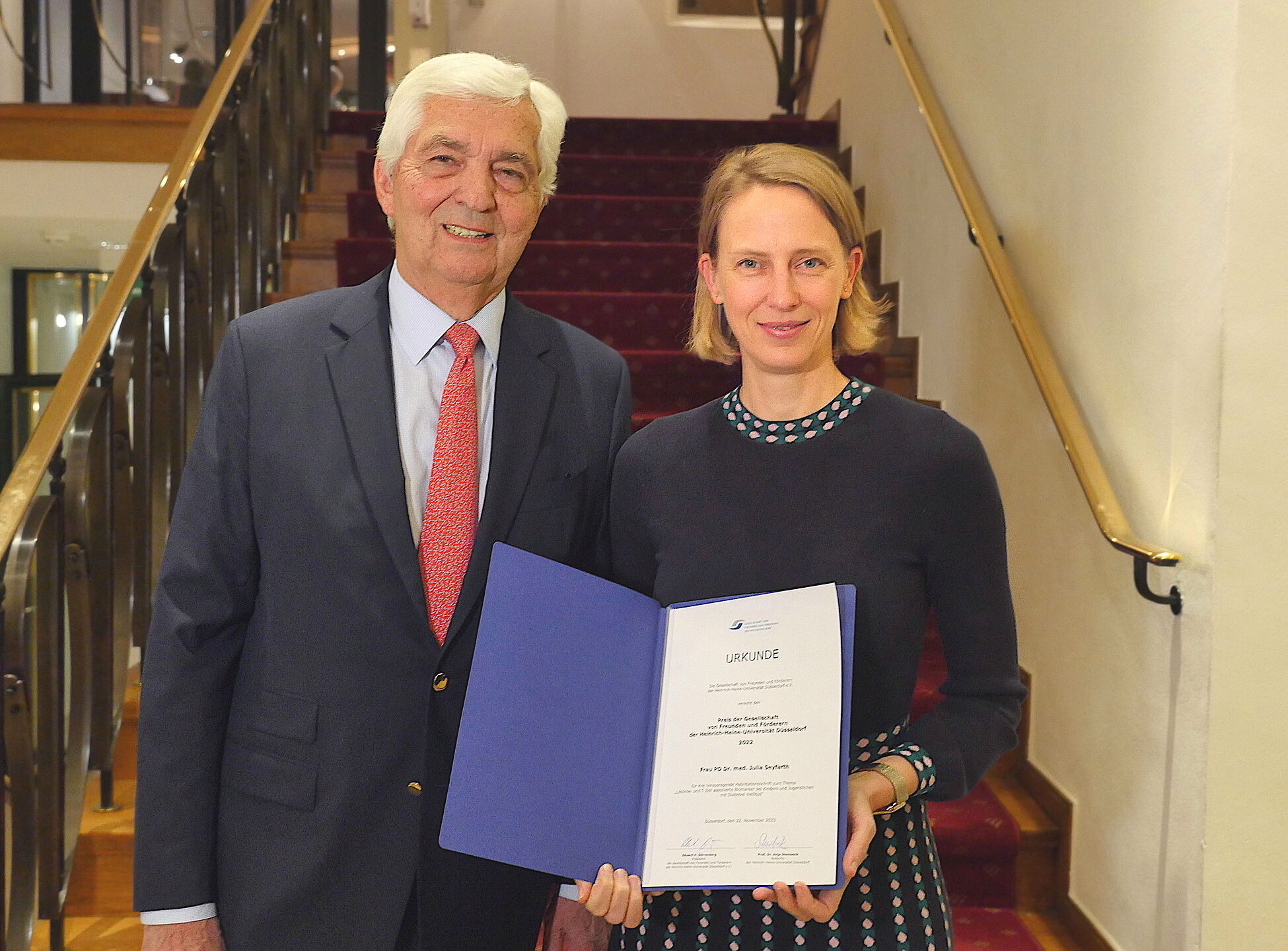 Preisverleihung GFFU-Preis 2022: Preisträgerin PD Dr. Julia Seyfarth vom Universitätsklinikum Düsseldorf, neben GFFU-Präsident Dörrenberg