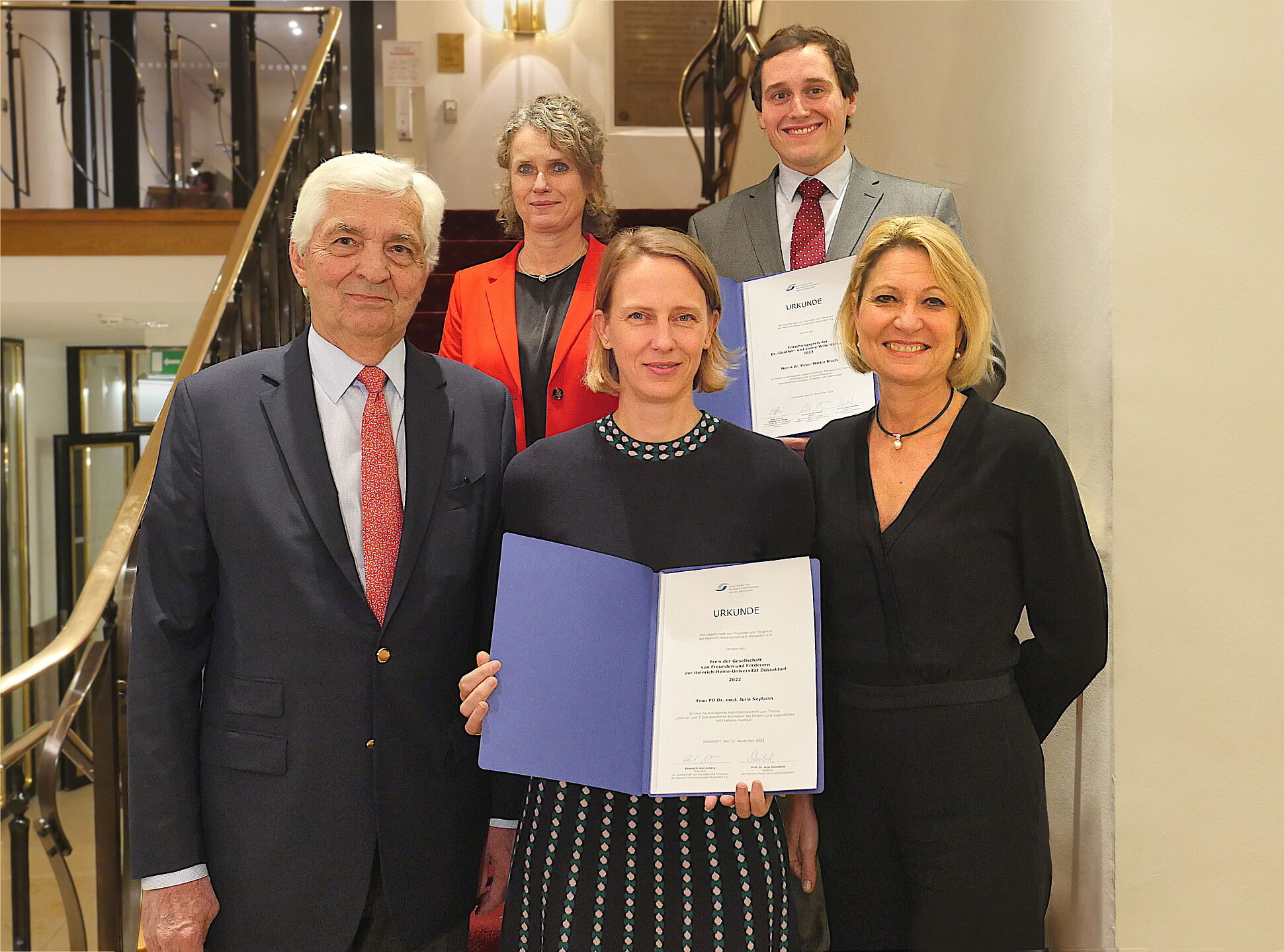 Preisverleihungen bei der GFFU-Jahresveranstaltung 2023. Vordere Reihe (v.l.n.r.): GFFU-Präsident Eduard H. Dörrenberg, GFFU-Preis-Gewinnerin Dr. Julia Seyfarth (UKD), HHU-Rektorin Prof. Dr. Anja Steinbeck; obere Reihe: (nicht im Bild: Heynen-Preis-Gewinnerin Prof. Dr. Ursula Hennigfeld), Prof. Dr. Stefanie Ritz-Timme (Vorsitzende Wille-Stiftungskurato-rium) und Preisträger des Wille-Preises Dr. Peter-Martin Bruch (UKD).