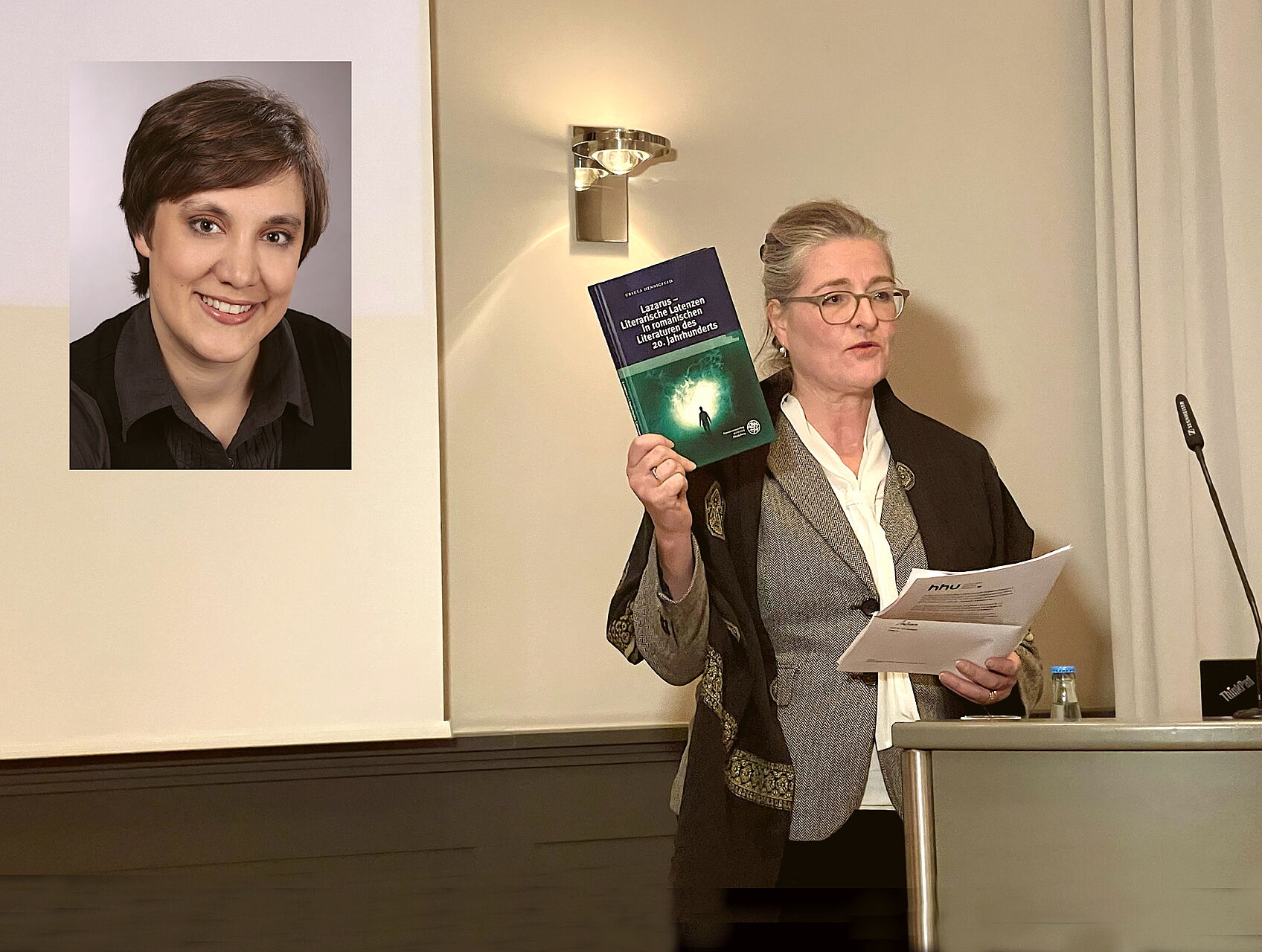 Preisträgerin Prof. Dr. Ursula Hennigfeld (links) konnte nicht an der Feier teilnehmen – Laudatorin Prof. Dr. Ulli Seegers, Dekanin der Philosophischen Fakultät, zeigt eine ihrer Monografien.