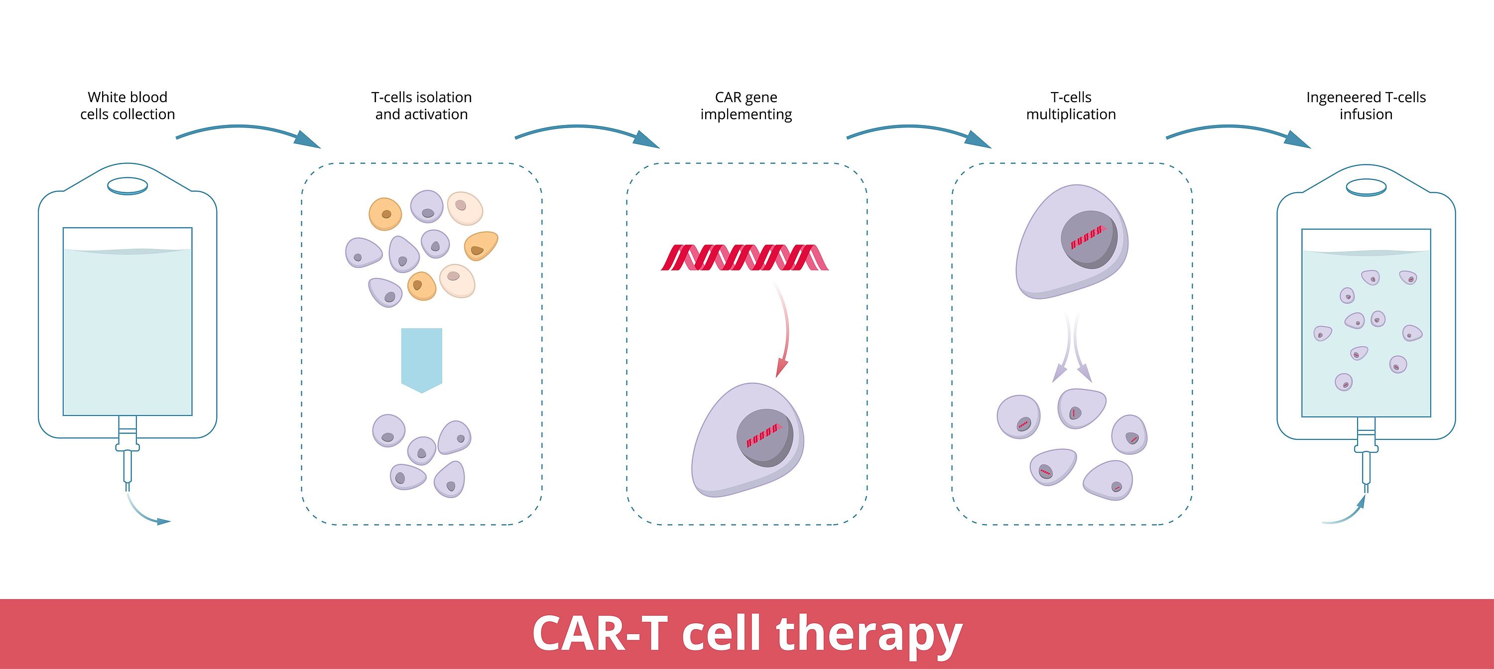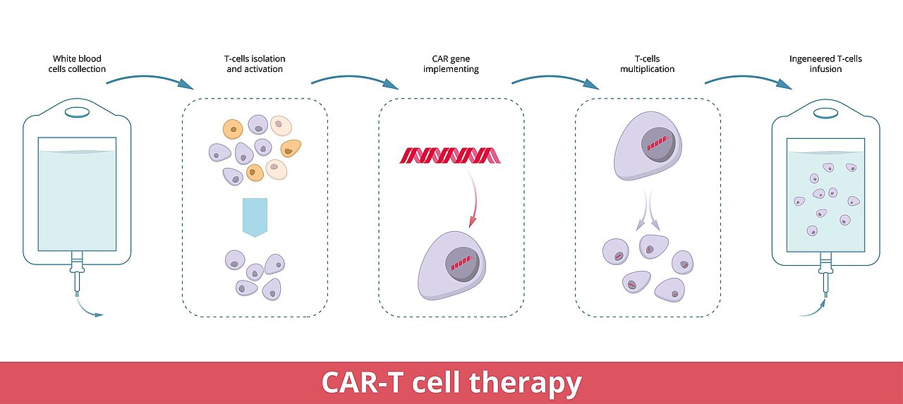 Die CAR-T-Zelltherapie ist eine neuartige Behandlungsform, bei der körpereigene Immunzellen, sogenannte T-Zellen, gentechnisch so modifiziert werden, dass sie Krebszellen gezielt erkennen und zerstören können. Hier eine schematische Darstellung.