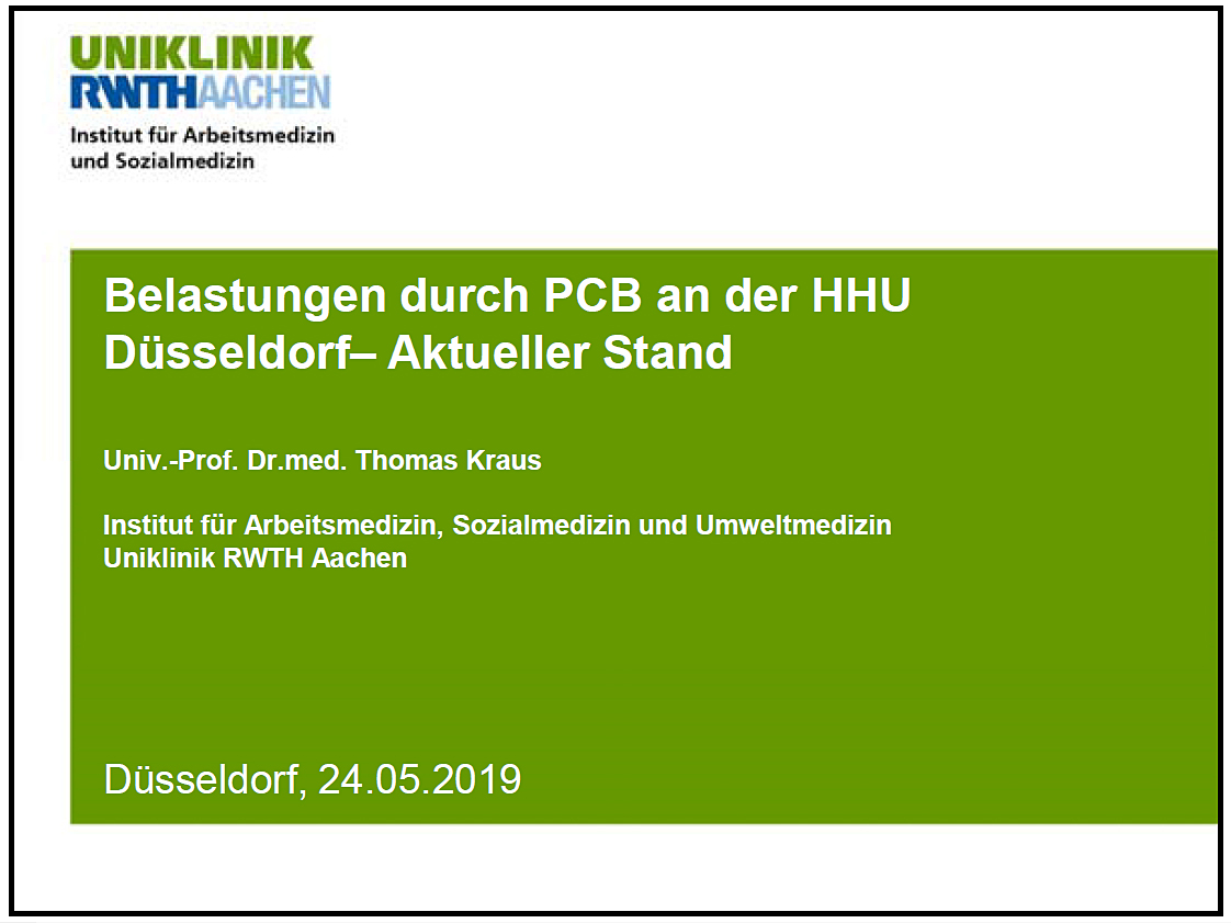 Zunächst beschrieb er, welche PCBs im Blut nachgewiesen werden können. Dann fasste er die seitens HHU und BLB vorgenommenen Maßnahmen zur Reduktion der Belastung zusammen und erläuterte die Ergebnisse der PCB-Raumluftmessung in den Gebäuden 23.02, 23.03, 23.11 und 23.12.