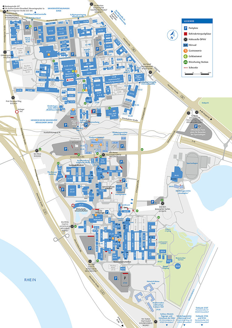 Sie finden die Einrichtungen der Heinrich-Heine-Universität Düsseldorf (HHU) und des Universitätsklinikums (UKD) auf dem gemeinsamen Campus im Düsseldorfer Süden, nur etwa 3,5 Kilometer vom Stadtzentrum und vom Hauptbahnhof entfernt.