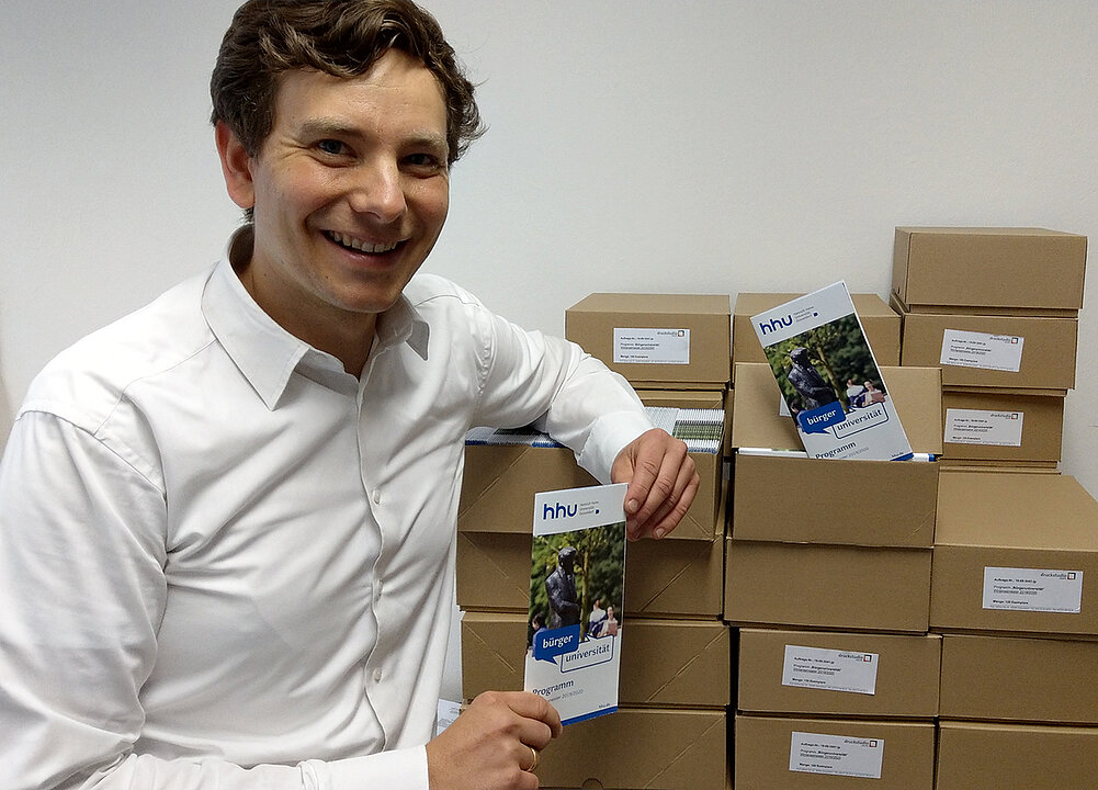 Über 60 spannende Formate bietet das neue Programm der Bürgeruniversität, das Dr. Marcel Solar präsentiert. (Foto: HHU/Arne Claussen).