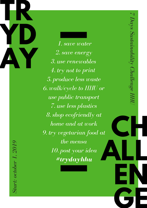 Einen Tag lang nicht drucken, öffentliche Verkehrsmittel nutzen oder regional und saisonal essen – eine Checkliste der HHU zeigt, wie leicht es ist, in verschiedenen Lebensbereichen ressourcenschonend aktiv zu sein. „Nachhaltigkeit ist ein Thema, das uns auch an der Universität intensiv beschäftigt. Mit dem TryDay wollen wir darauf aufmerksam machen, wie jede/r mit persönlichen Schritten die Umwelt schonen kann. Und wir suchen nach kreativen Ideen, wie wir als Studierende/r, Mitarbeiter/in oder Wissenschaftler/in auf dem Campus nachhaltiger agieren können“, sagen die Organisatorinnen Dr. Madlen Kazmierczak und Isabel Strauß.