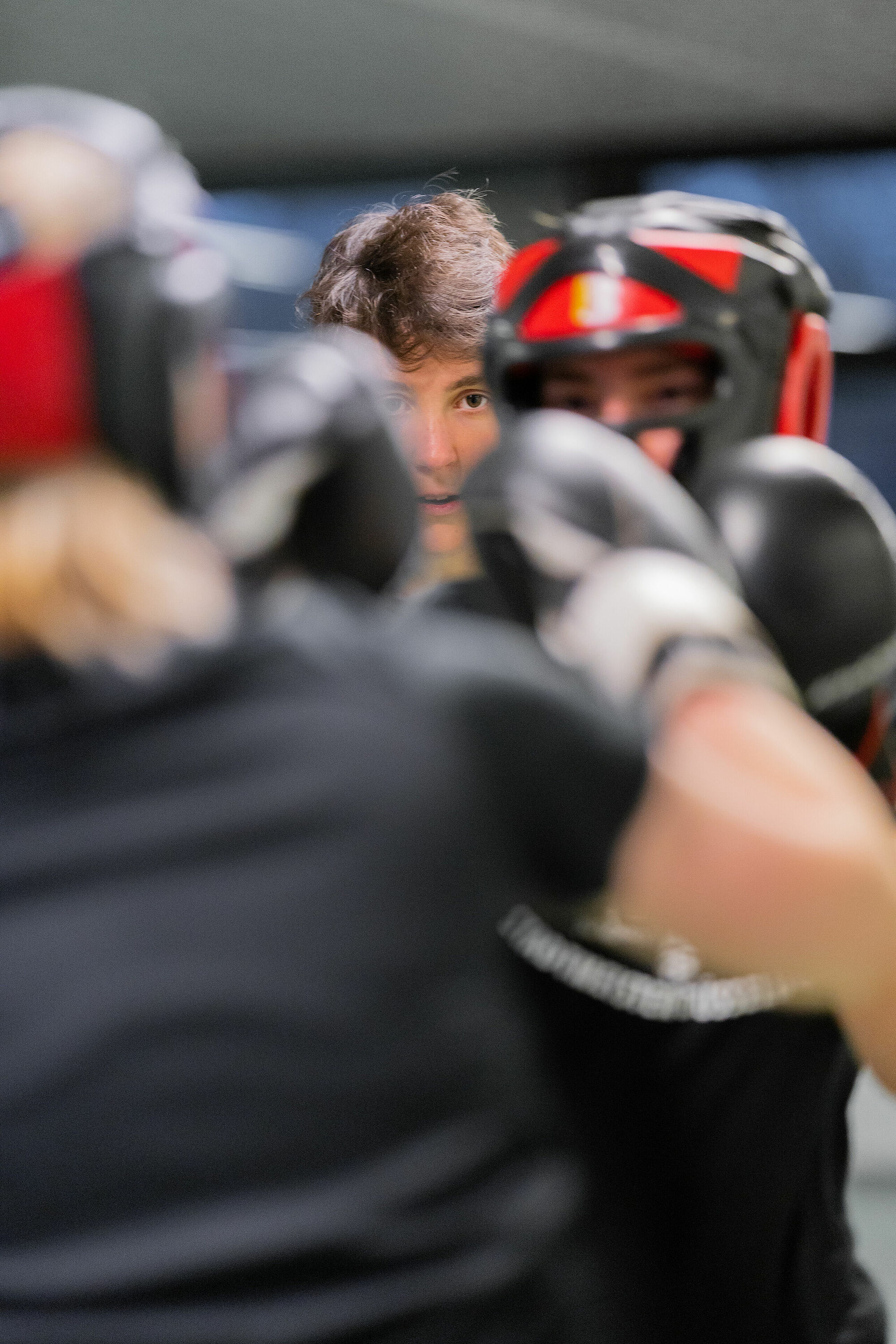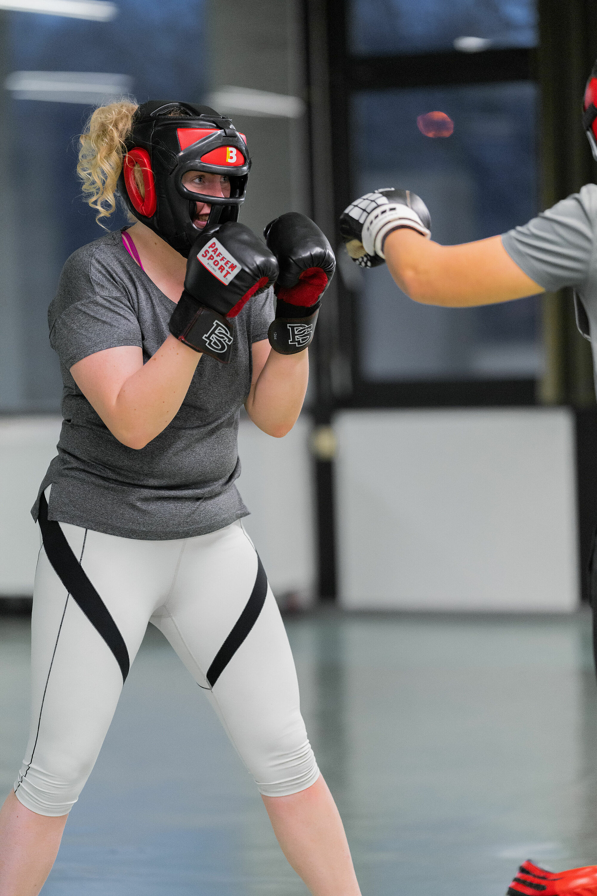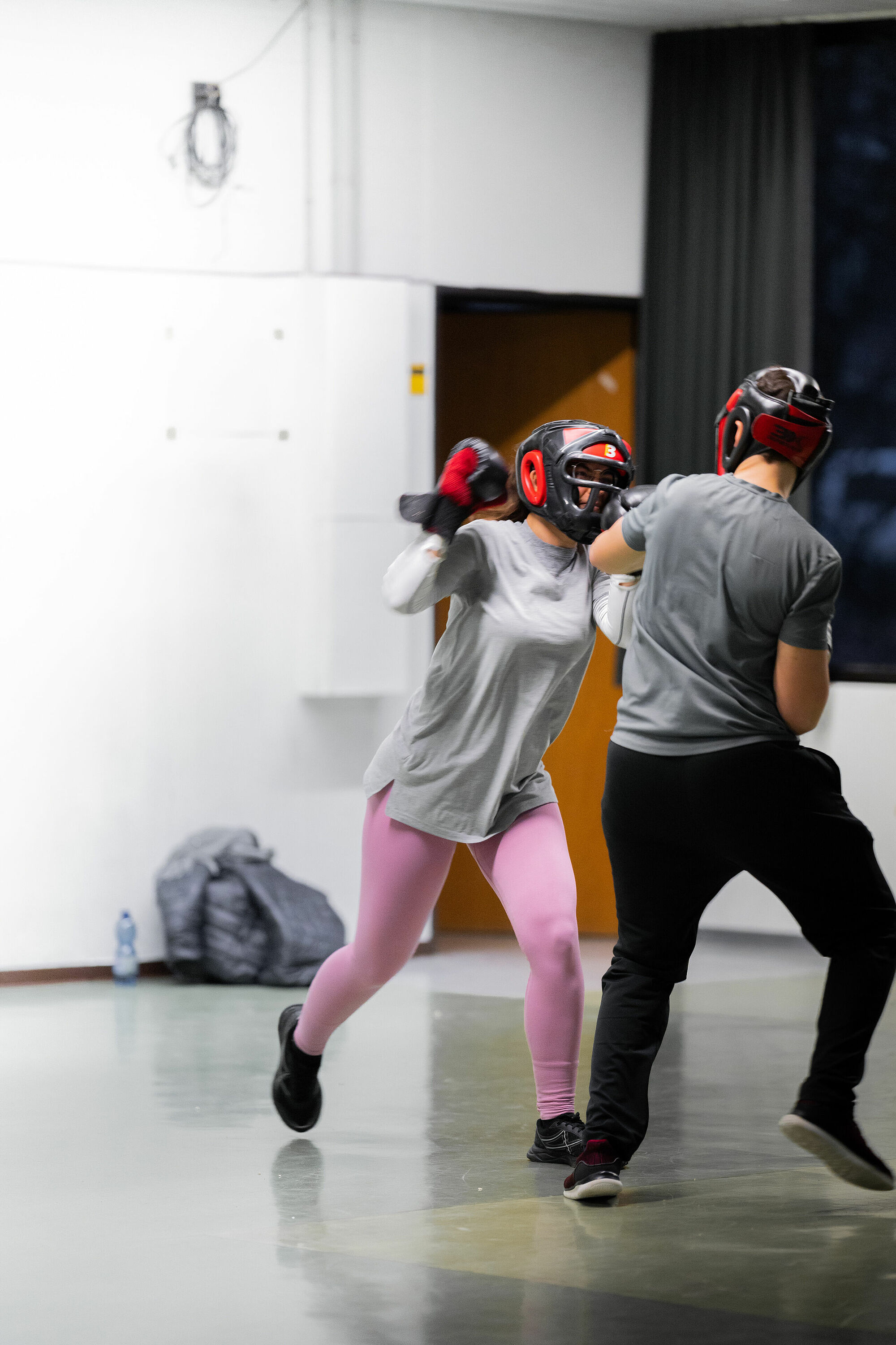 „Hau rein“, ruft Studentin Lilli Hahn grinsend und wirft Michelle Mommertz Boxhandschuhe zu. Beide stülpen sich zusätzlich einen rotschwarzen Kopfschutz über. „Das ist noch mal ein anderes Kaliber“, klingt Hahns Stimme gedämpft aus dem helmartigen Konstrukt. „Doch wenn man die Dinger aufhat, tut es nicht weh.“ Während die Boxhandschuhe durch die Luft sausen, gibt Mommertz Tipps: „Denk daran, deinen Kopf zu schützen, auch wenn du dich gerade auf einen Tritt oder Tiefschlag konzentrierst. Und wechsele immer mal deine Position, bleib nicht stehen.“