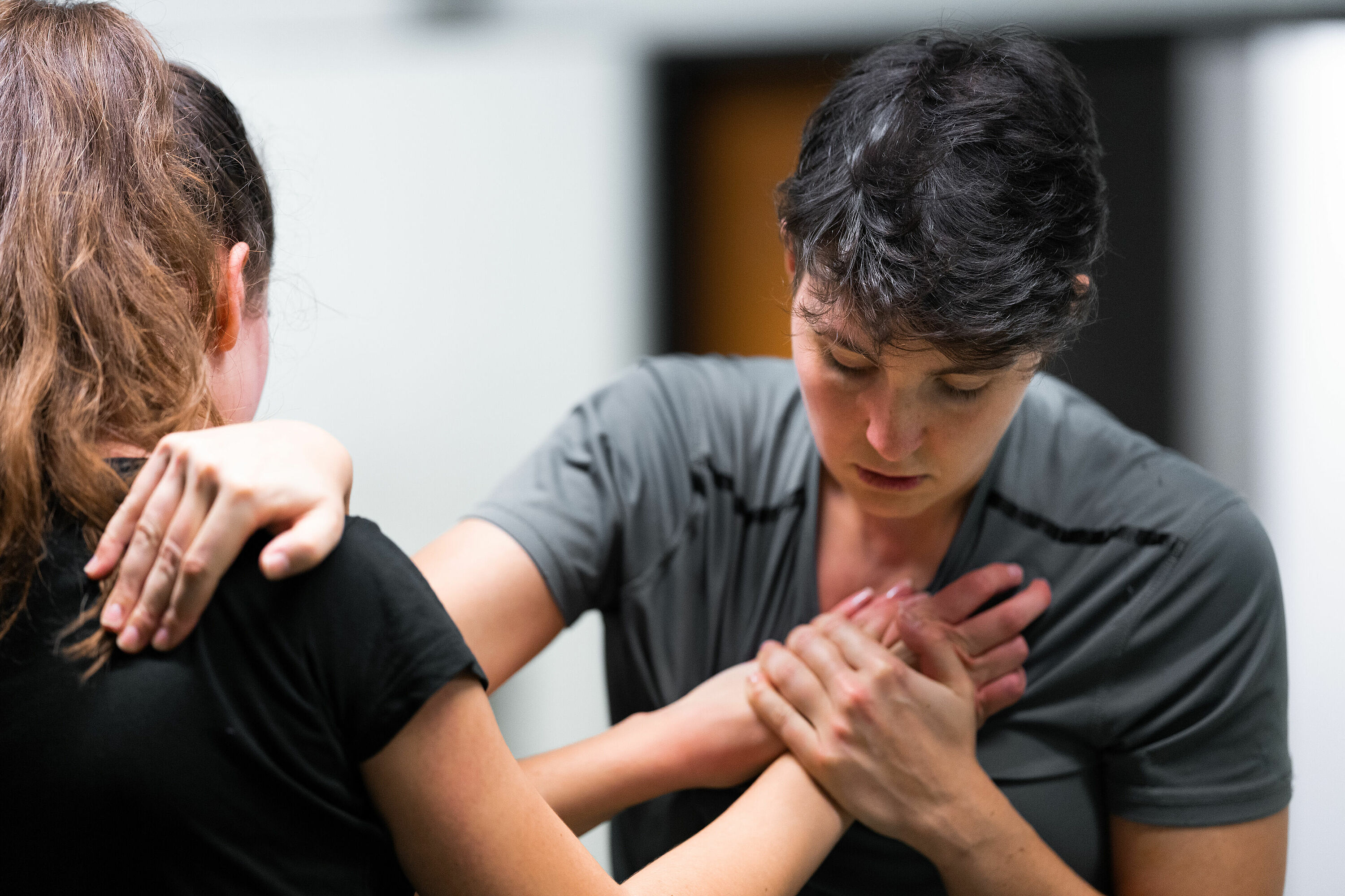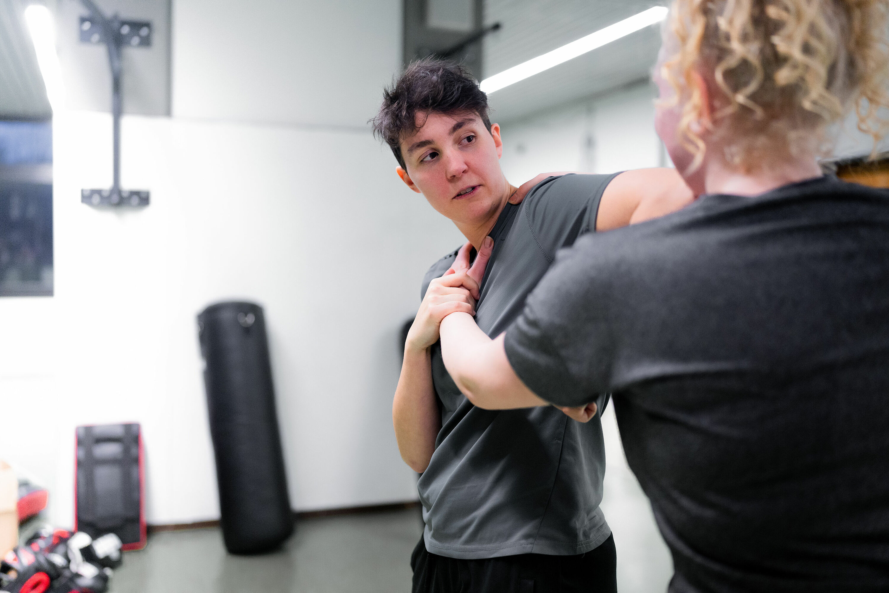 Boxhandschuhe knallen, es wird gelacht, geschwitzt, gekeucht. Sieben Menschen schlittern über den Linoleumboden, wechseln spielerisch die Rollen: greifen plötzlich an und verunsichern oder verteidigen sich mit festem Blick. Es geht hier nicht um 1-a-Kampfsportbewegungen, sondern darum zu lernen, wie man sich in unklaren Situationen behauptet. Die Techniken, die Trainerin Michelle Mommertz erklärt, kommen aus Krav Maga, Karate und Kickboxen. „Jemand würgt dich – was tust du?“, fragt sie in die Runde. Und zeigt gleich darauf die Antwort: „Schultern hochziehen, – das klemmt die Finger der angreifenden Person ein –, einen Arm heben, schwungvoll auf den Ellenbogen des Gegenübers krachen lassen und sich aus der Umklammerung herausdrehen.“