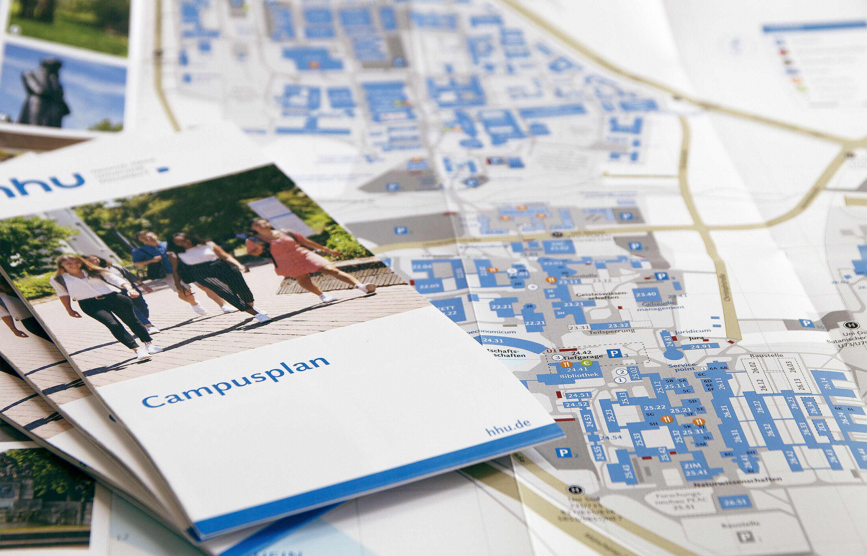 Die gedruckten Faltpläne (geschlossenes Format DIN Lang, offen 50 x 42 cm) können im Geschäftszimmer der Stabsstelle Veranstaltungen, Marketing-Service und Fundraising unter kommunikation(at)hhu.de angefordert werden. Sie werden mit der Hauspost versandt.