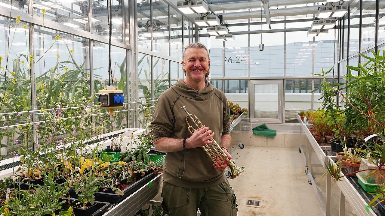 Jochen Stappmanns trompetet seit seinem zehnten Lebensjahr, zusätzlich ist er begeisterter Chorsänger und musiziert in seiner Heimatgemeinde. An der HHU ist er als Gärtner für die Forschungsgewächshäuser zuständig, hier unter anderem auch für die Gewächshäuser auf den Dächern des 26.14er-Gebäudetrakts. Zusammen mit seinen Kolleginnen und Kollegen zieht er dort Pflanzen für Forschung und Lehre an, hegt und pflegt sie.