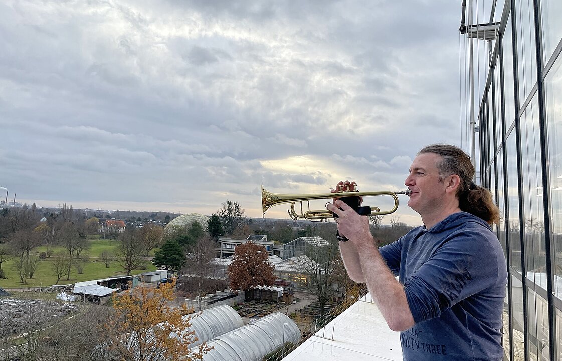 Im ersten Coronajahr kam Stappmanns auf die Idee, sein Instrument zur Arbeit ins Forschungsgewächshaus mitzubringen und Adventslieder zu spielen. Am kommenden Mittwoch, am Nikolaustag, wird er wieder eine halbe Stunde lang klassische Weihnachtslieder und andere Stücke aus der Adventszeit spielen. Wer den Trompeter oben beim Gewächshaus besonders gut hören und sehen will, geht zum Nordeingang des Botanischen Gartens. Dieser liegt ganz in der Nähe der Straßenbahnhaltestelle ‚Uni Ost‘.