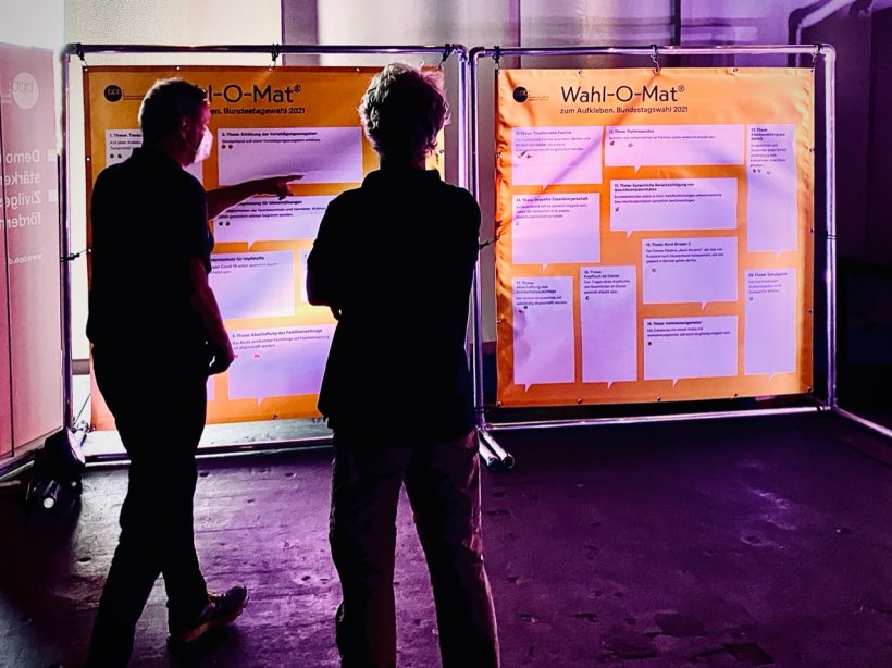 Beim Wahl-O-Mat zum Aufkleben können Interessierte sich mithilfe von Klebepunkten zu den Thesen positionieren. Anschließend erhalten sie das Ergebnis direkt per Ausdruck. „Im Gegensatz zur digitalen Version ist die Positionierung der Nutzerinnen und Nutzer für alle sichtbar. Dadurch ergeben sich spannende Diskussionen rund um die zentralen Themen dieser Wahl“, so Prof. Marschall.