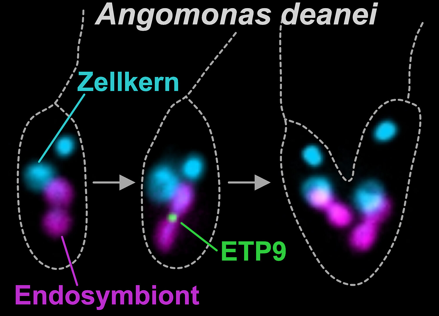 2022 berichtete das Düsseldorfer Forschungsteam in „Current Biology“, dass mehrere Proteine, die von der Wirtszelle produziert werden, mit dem Endosymbionten interagieren. Eines dieser Proteine, genannt ETP9, bildet einen Ring um die Teilungsstelle des Endosymbionten (siehe Meldung vom 7. Dezember 2022). Nun fanden die Forschenden um Nowack und ihrem Doktoranden Anay Maurya heraus, dass die Endosymbionten der Strigomonadinae – die ja früher eigenständige Bakterien waren – fast alle für die Teilung notwendigen Gene verloren haben. Das Gen, das das Protein FtsZ beschreibt und das in Bakterien und den meisten Organellen die Teilungsstelle markiert, ist eines der wenigen noch vorhandenen bakteriellen Zellteilungsgene.