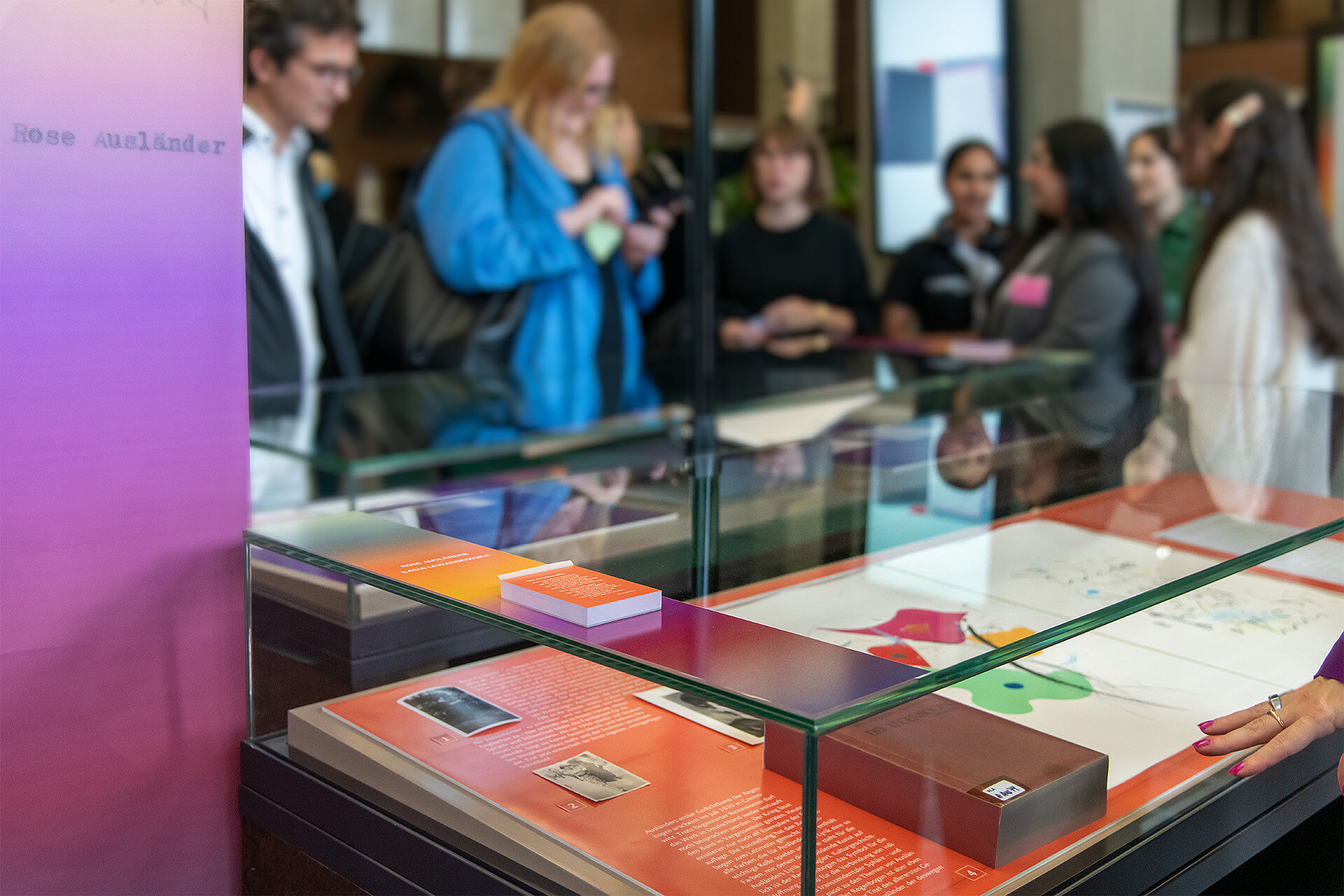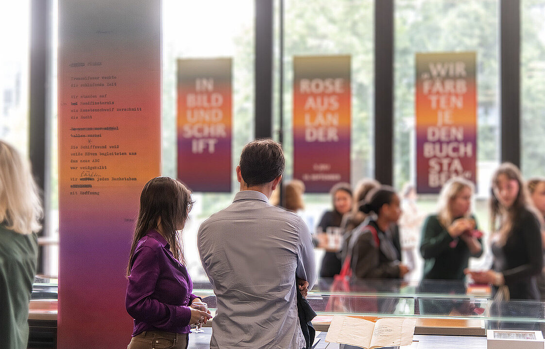 Die Ausstellung beinhaltet eine kuratierte Auswahl von Künstlerbüchern aus dem Bestand der ULB, in denen Künstlerinnen und Künstler wie Otto Piene, Theresia Schüllner und Petra Maria Lorenz Ausländers Gedichte interpretieren. Einige von ihnen waren bei der Eröffnung persönlich vor Ort, um sich das Ergebnis gemeinsam mit vielen weiteren Interessierten anzusehen.