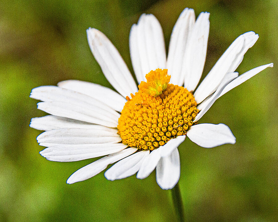 Auch der Blütenkopf der Margerite (Leucanthemum spec.) besteht aus vielen Einzelblüten: Gelbe, zwittrige Röhrenblüten sind umgeben von weißen, weiblichen Blüten. „Da der Blütenkopf so offen ist, wird er auch von vielen Bestäubern besucht, die unter anderem durch den starken Farbkontrast angelockt werden“, erläutert Sabine Etges. Die Einzelblüten bilden einen gemeinsamen „Schauapparat“.