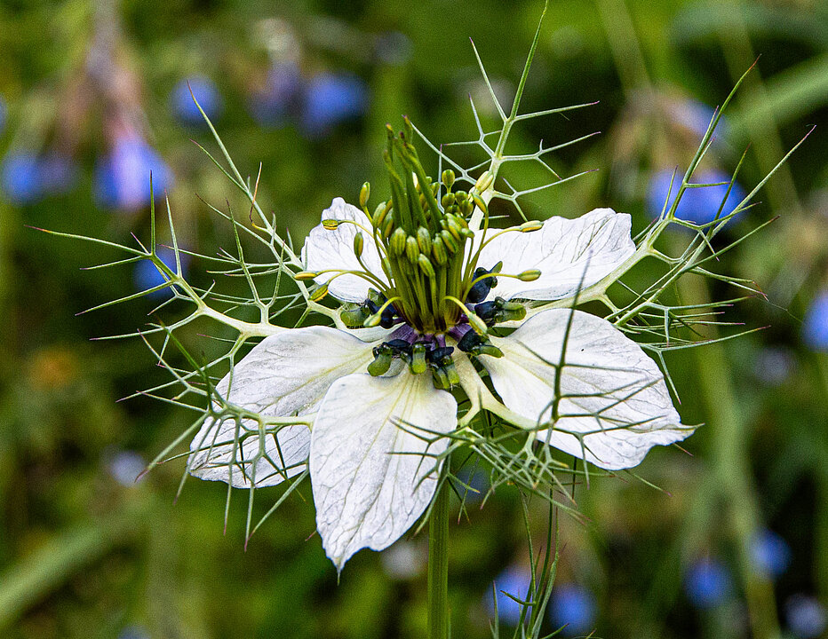 Durch die Ko-Evolution mit den Bestäubern ist außerdem eine große Vielfalt von Blütenformen und Bestäubungsstrategien entstanden. Belohnung für den Blütenbesuch kann zum Beispiel Pollen oder Nektar sein – eine Art Zuckerwasser, das immer wieder nachproduziert wird. Ein Beispiel ist der Schwarzkümmel (Nigella spec.). Dr. Etges: „Die Blüten sind vormännlich, das heißt zuerst reifen die Staubblätter, dann die Fruchtblätter. So soll eine Selbstbestäubung verhindert werden. Die Blüten bilden ihren Nektar in kleinen lilafarbenen Spornen, die mit Deckeln verschlossenen sind. Etges: „Wenn Bienen oder Hummeln an den Nektar gelangen möchten, müssen sie ihren Rüssel in den Spalt im Deckel zwängen. Wenn sich die Bestäuber so von Nektarsporn zu Nektarsporn arbeiten, bestäuben sie die Griffel beziehungsweise streifen sich bei jüngeren Blüten den Pollen in die Behaarung.“