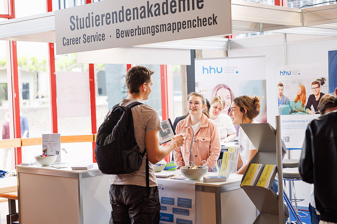 Die HHU unterstützt ihre Studierenden auch über das Studium hinaus auf dem Weg ins Berufsleben. Im begleitenden Vortragsprogramm von 12:30 Uhr bis 17:00 Uhr gibt es neben Unternehmenspräsentationen auch wichtige Tipps zu Themen wie Gehaltsverhandlungen und dem richtigen Auftreten im Vorstellungsgespräch. Bewährt hat sich der ‚Bewerbungsmappen-Check‘ des Career Service der HHU (Stand in Gebäude 22.01).