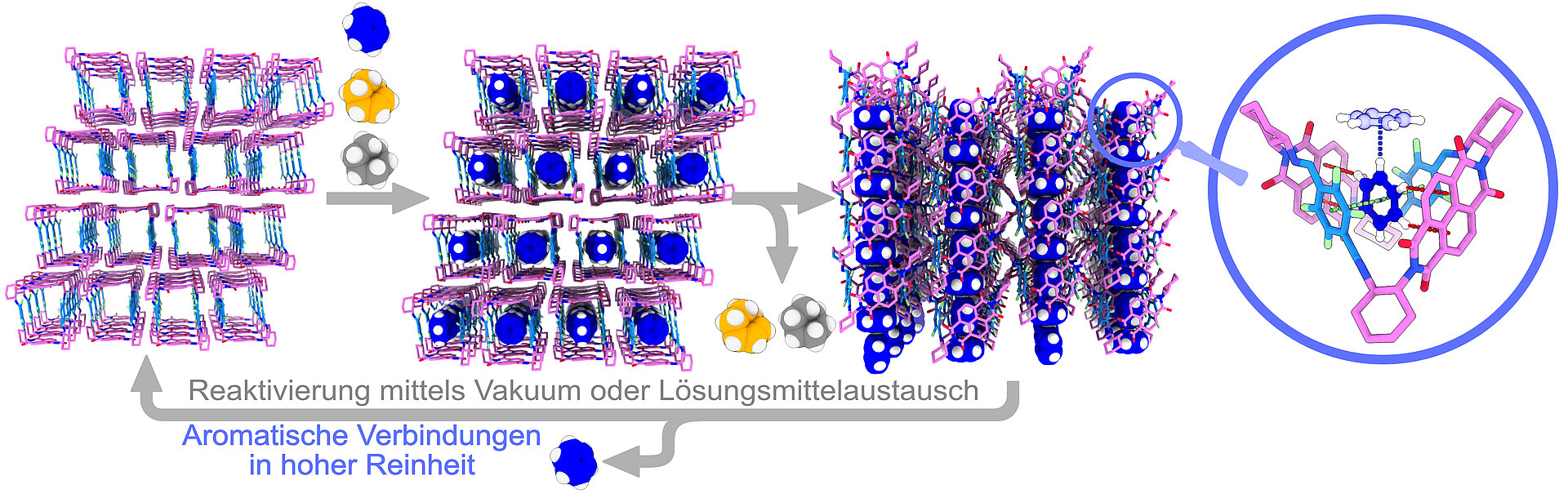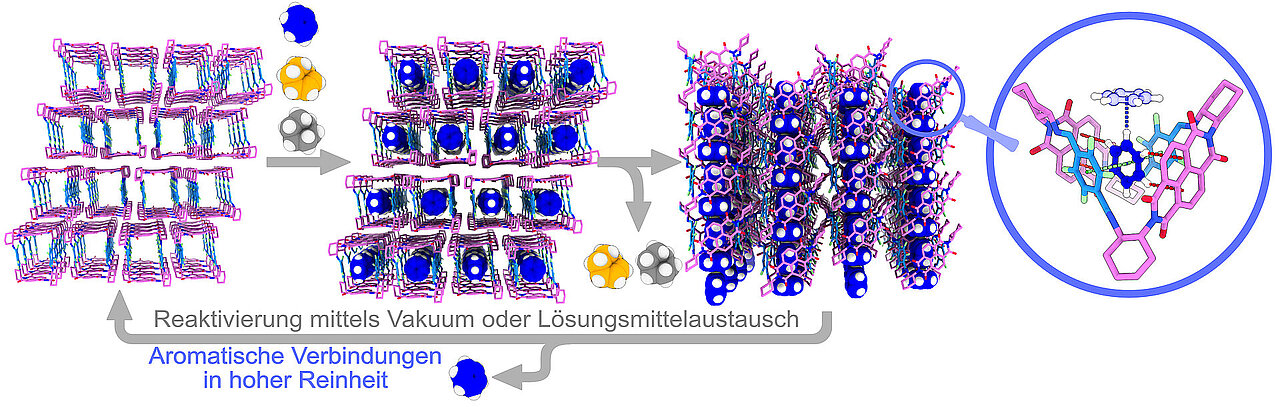 Das Forschungsteam um den HHU-Chemiker Dr. Bernd M. Schmidt (Nachwuchsgruppe Funktionale Supramolekulare Systeme) hat zusammen mit der Arbeitsgruppe von Prof. Dr. Christoph Janiak (Lehrstuhl für nanoporöse und nanoskalierte Materialien) eine „supramolekulare Sortiermaschine“ entwickelt, die die Trennung auf andere Weise erledigen kann. Sie besteht aus elektronenarmen, fluorierten Makrozyklen mit rechteckiger Struktur, genannt „Squareimine“. Sie adsorbieren bevorzugt aromatische Moleküle.