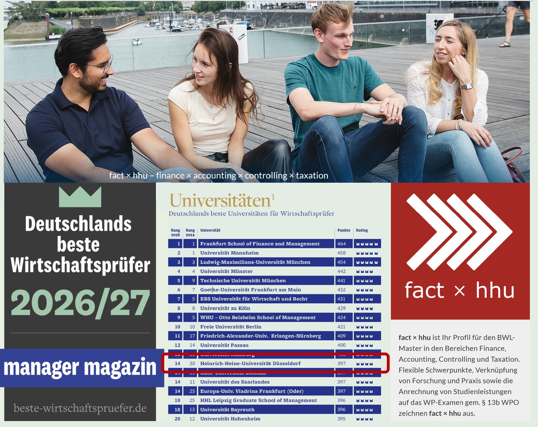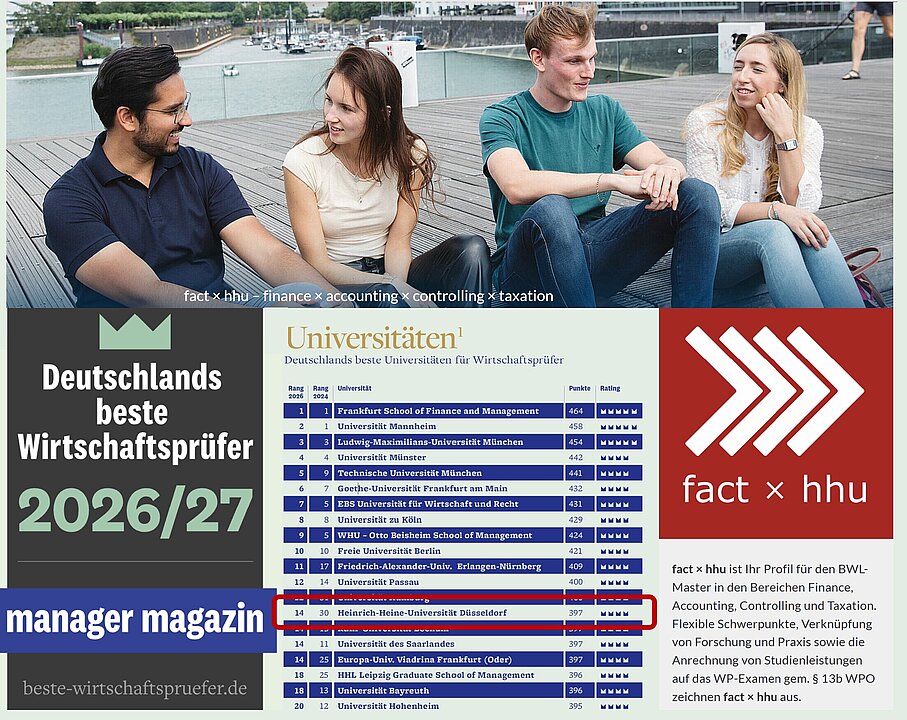 Die von „manager magazin“ und der Wissenschaftlichen Gesellschaft für Management und Beratung mbh (WGMB) befragten 80 mittelständischen Kanzleien und 732 Mandanten wählten das fact x hhu-Programm im BWL-Master unter die besten akademischen Adressen für die Ausbildung von Wirtschaftsprüfern in Deutschland.