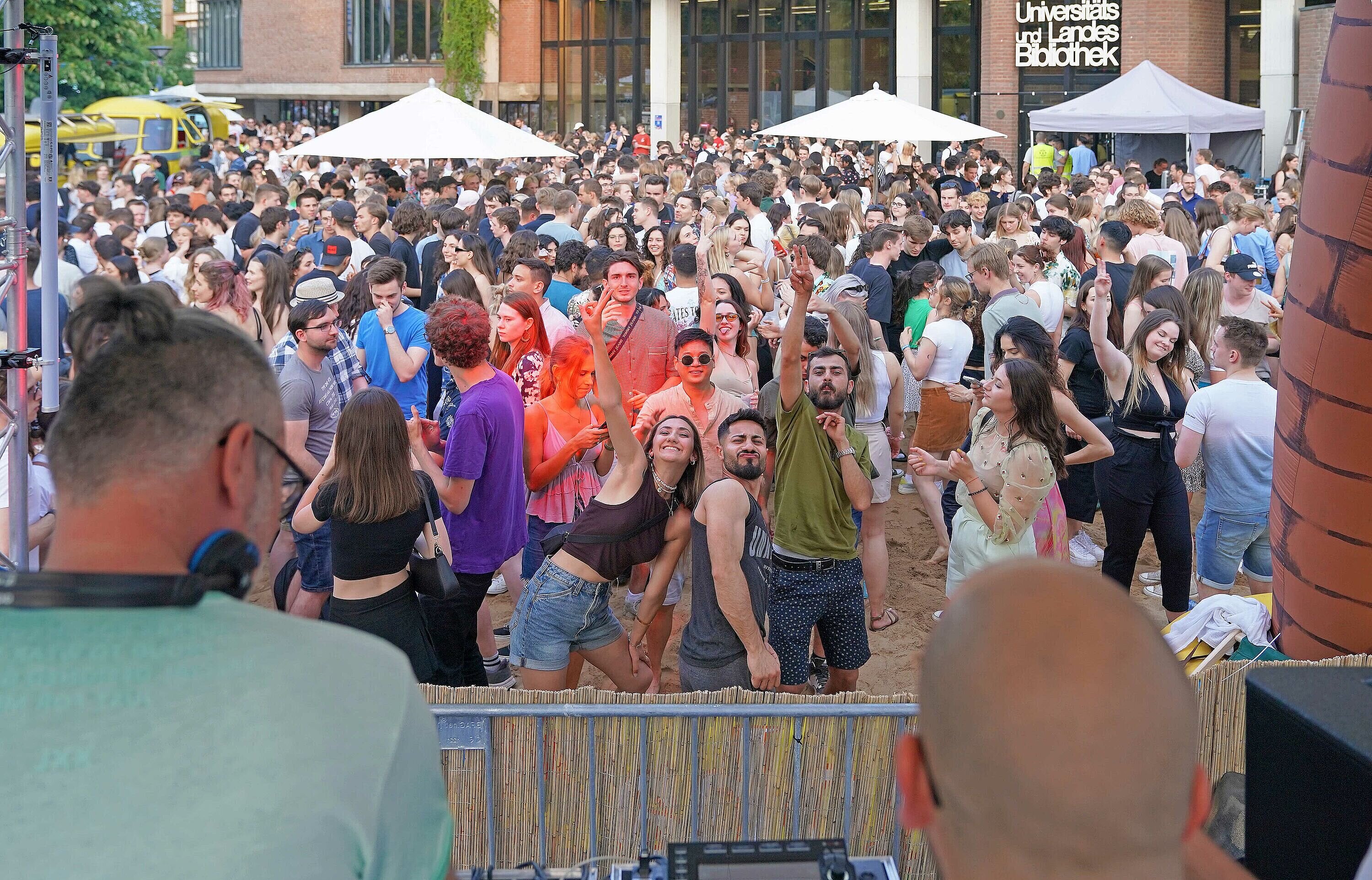 „Eine Universität besteht nicht nur aus Forschung und Lehre – gemeinsames Feiern unter Palmen gehört auch dazu. Es hat Spaß gemacht, in so viele fröhliche Gesichter zu blicken“, freut sich Rektorin Prof. Dr. Anja Steinbeck, die diese Party erneut initiiert hatte. Sie soll künftig alle zwei Jahre stattfinden – immer im Wechsel mit der Nacht der Wissenschaft, die für 2024 geplant ist. Geplant und umgesetzt werden solche Events vom Team der Stabsstelle Veranstaltungen, Marketing-Service und Fundraising.
