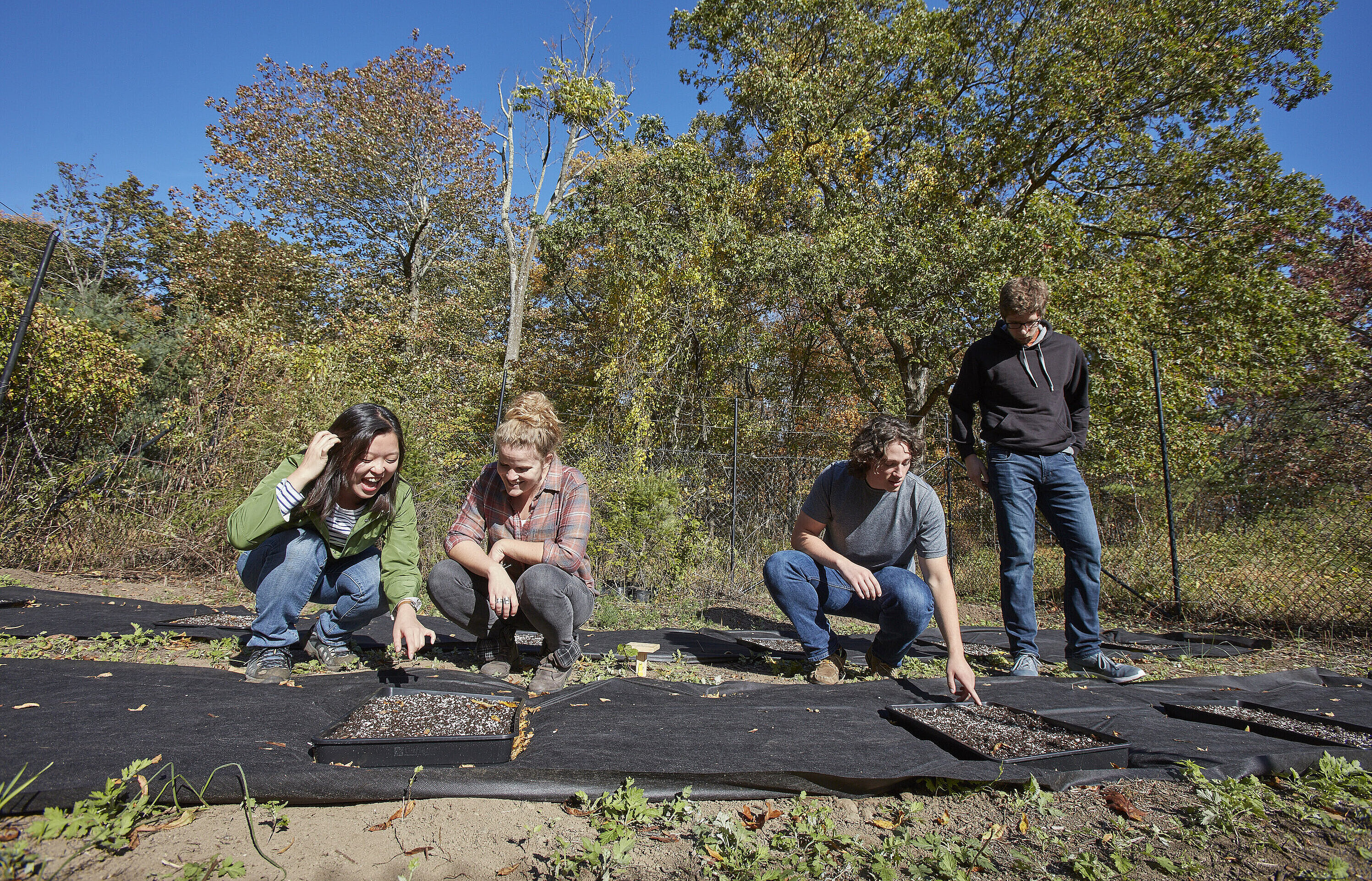 Einrichtung des Versuchsgeländes und erste Aussaat im Jahr 2017 an der Fordham University in New York. Postdoc Dr. Elena Hamann (2.v.l.) beobachtet gemeinsam mit Studierenden aus dem Labor von Prof. Dr. Steven J. Franks – in dem Hamann damals arbeitete – die Keimung der Pflanzen. (Foto: Matthew Septimus)
