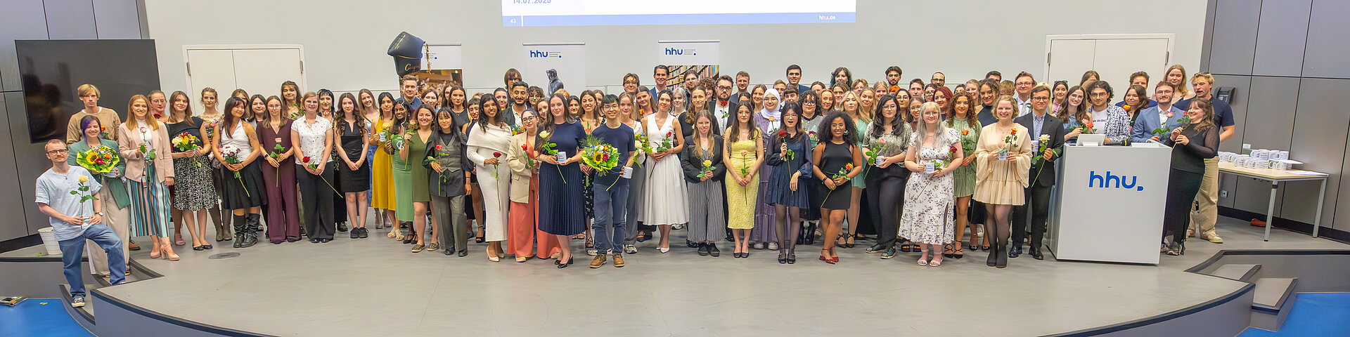 Dekanin Prof. Dr. Ulli Seegers und Studiendekan Dr. Frank Meier wandten sich mit herzlichen Worten an die Absolventinnen und Absolventen. Als Vertreterin der Examinierten hielt Eva Marschall, Bachelor-Absolventin des Fachs Transkulturalität, eine eindrucksvolle Ansprache mit Bezügen zum aktuellen Zeitgeschehen. So verwies sie in ihrer Rede auf den Namensgeber der Universität Heinrich Heine, der seinerzeit vor der Gefährlichkeit von deutschem Nationalismus warnte, „dass er nicht aus dem Nichts kommt, dass er an Unis gedeihen kann“. Marschall machte aber ebenso deutlich, dass Studierende und Wissenschaftler*innen mit ihren Stimmen dem durchaus trotzen könnten, „weil wir widersprechen, hinterfragen, sichtbar sind“ und „weil wir laut sein können“.
