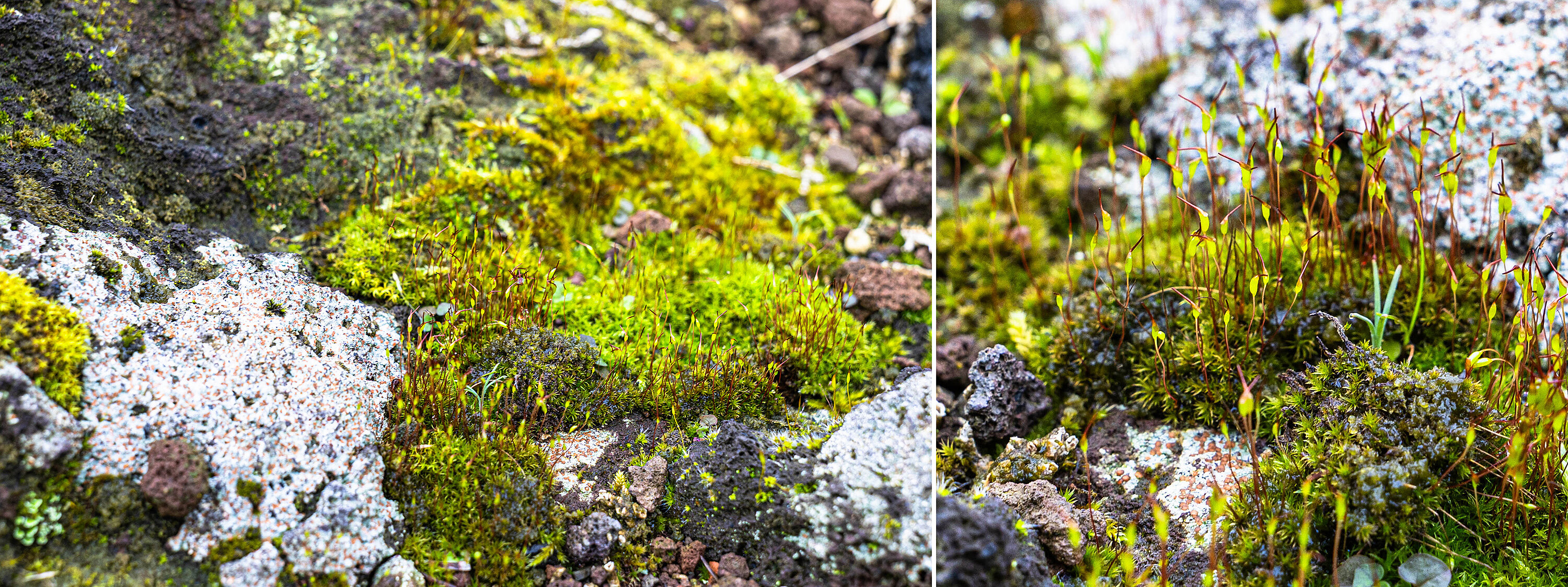 Häufig werden Flechten und Moose verwechselt, beziehungsweise werden die Begriffe im allgemeinen Sprachgebrauch synonym verwandt. Etges: „Tatsächlich sind beide aber nicht miteinander verwandt. Moose sind sehr ursprüngliche Pflanzen, die früh in der Evolution entstanden.“ Beim Moos lohnt es sich, es von nahe oder mit einer Lupe im Detail zu betrachten. So wachsen beim Laubmoos aus den beblätterten Pflänzchen zarte Stiele heraus. Sie sind die Träger der Sporenkapseln.