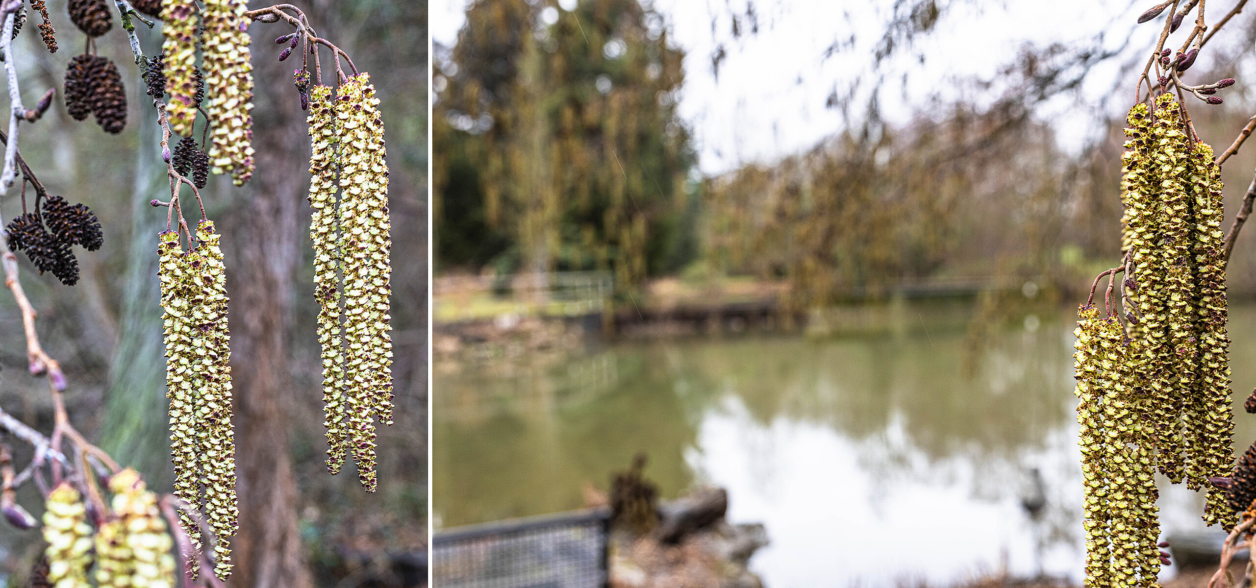 Daneben knospen und blühen viele Bäume, etwa der Duftende Schneeball (Viburnum farreri) und zahlreiche Obstbäume. Im Botanischen Garten ist besonders die Tulpen-Magnolie (Magnolia x soulangeana ‚Lennei‘) eindrucksvoll. Die Sorte blüht später als die reine Art und steht Ende März und im April in voller Blüte. Und am Ufer der Gewässeranlage wachsen Schwarz-Erlen (Alnus glutinosa), die schon ihre länglichen, männlichen Blütenstände ausgebildet haben.