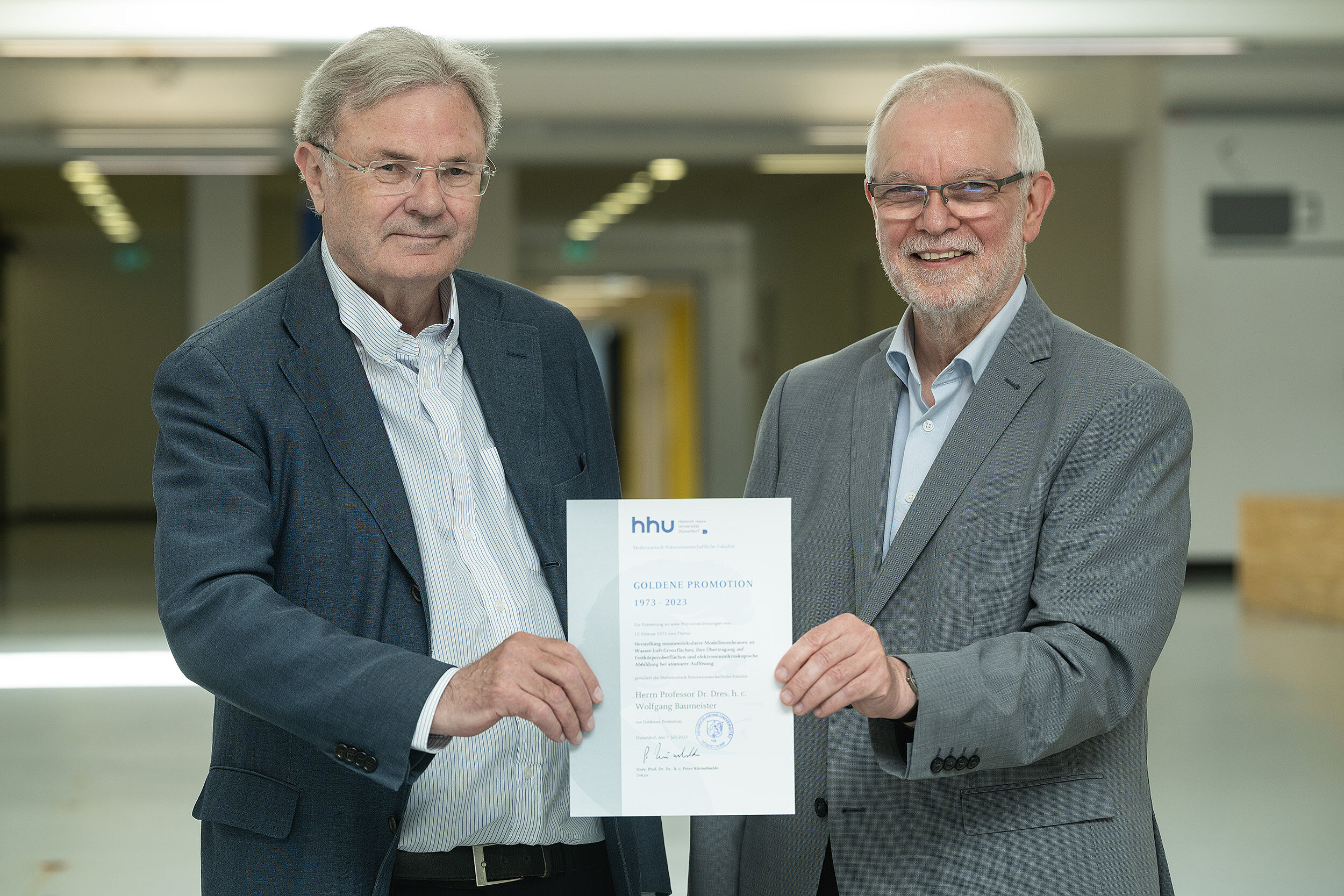 Prof. Dr. Dres.h.c. Wolfgang Baumeister promovierte 1973 bei Prof. Dr. Helmut Ruska im Bereich der Biophysik an der Universität Düsseldorf. 50 Jahre später ehrte Dekan Prof. Kleinebudde ihn als Goldpromovenden.