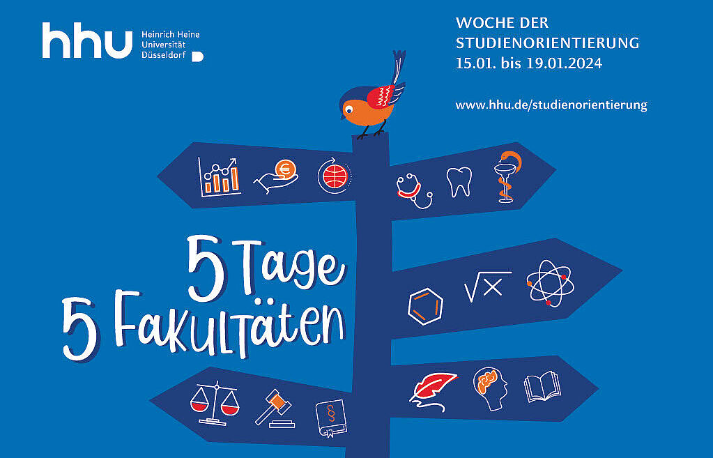 Mit zahlreichen Info-Angeboten beteiligt sich die Heinrich-Heine-Universität Düsseldorf (HHU) vom 15. bis zum 19. Januar 2024 an den landesweiten „Wochen der Studienorientierung“. Unter dem Motto ‚5 Tage – 5 Fakultäten‘ präsentiert sich jeden Tag eine Fakultät mit ihren Fächern und gewährt Einblick in den regulären Studienalltag, zahlreiche Vorlesungen werden für Studieninteressierte geöffnet.