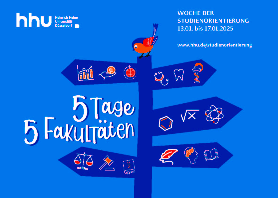 In der dritten Januarwoche erfahren Schülerinnen und Schüler, aber auch Eltern sowie Lehrerinnen und Lehrer, alles über Studiengänge, Berufsperspektiven, Bewerbungsverfahren und Zugangsvoraussetzungen an der HHU. Denn dann heißt es wieder Campusluft schnuppern, Vorlesungen besuchen, mit Lehrenden und Studierenden ins Gespräch kommen, Einrichtungen kennenlernen und Angebote der Studienberatung nutzen.
