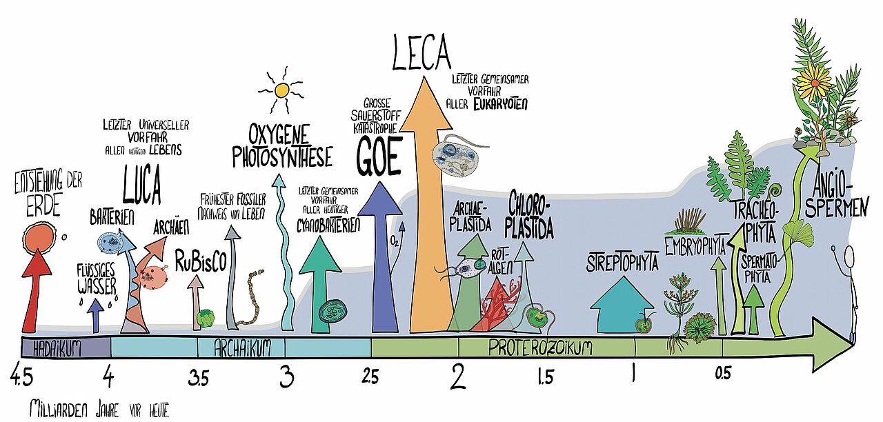 Nachdem die Erde geformt war, dauerte es nicht lange, bis auch das erste Leben entstand. Vor rund 4 Milliarden Jahren lebte LUCA, der letzte gemeinsame Vorfahr von Bakterien und Archäen, aus denen sich dann das weitere Leben entwickelte. In der Folge „erfanden“ Cyanobakterien die Photosynthese – was durch die damit verbundene Sauerstofffreisetzung fast zur Katastrophe für das frühe Leben geführt hätte.