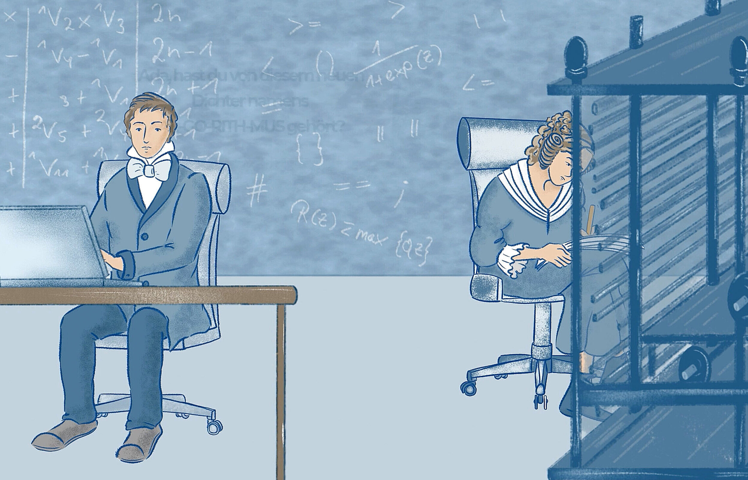 Wie alles beginnt: Die technikbegeisterte Ada Lovelace sitzt auf einer Bank in ihrem Lieblingspark St. James und brütet über ihren Notizen. „Gestatten Sie?“, fragt ein älterer Mann mit deutschem Akzent. „Ich bin durch Ihr grübelndes Gesicht auf Sie aufmerksam geworden. Sie schreiben...?“. „Mathematik ist eine Sprache“ beginnt Lovelace zu erklären. Es gebe da eine Maschine, die Zahlen, Symbole, Bilder und Text verarbeiten könne. Es sei sogar möglich, dass die Maschine Musikstücke komponiere. Die beiden vertiefen sich in ein Gespräch über Mathematik und Poesie.