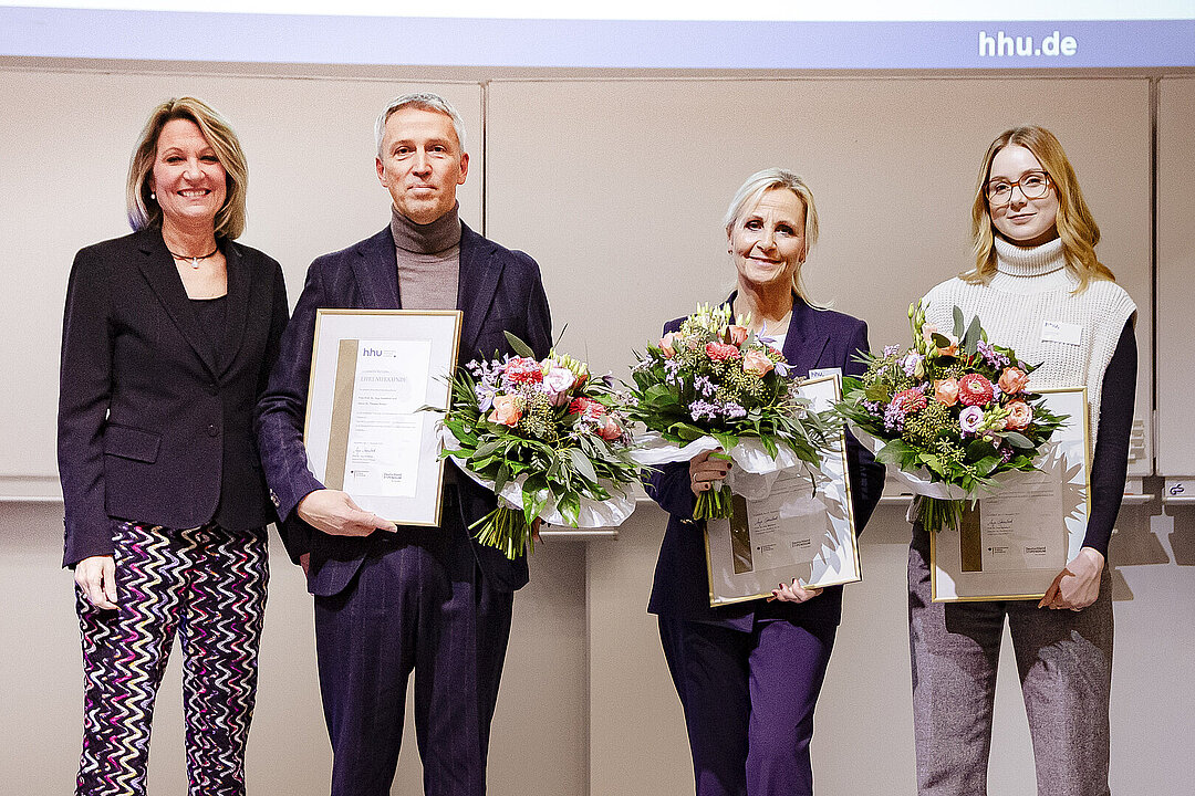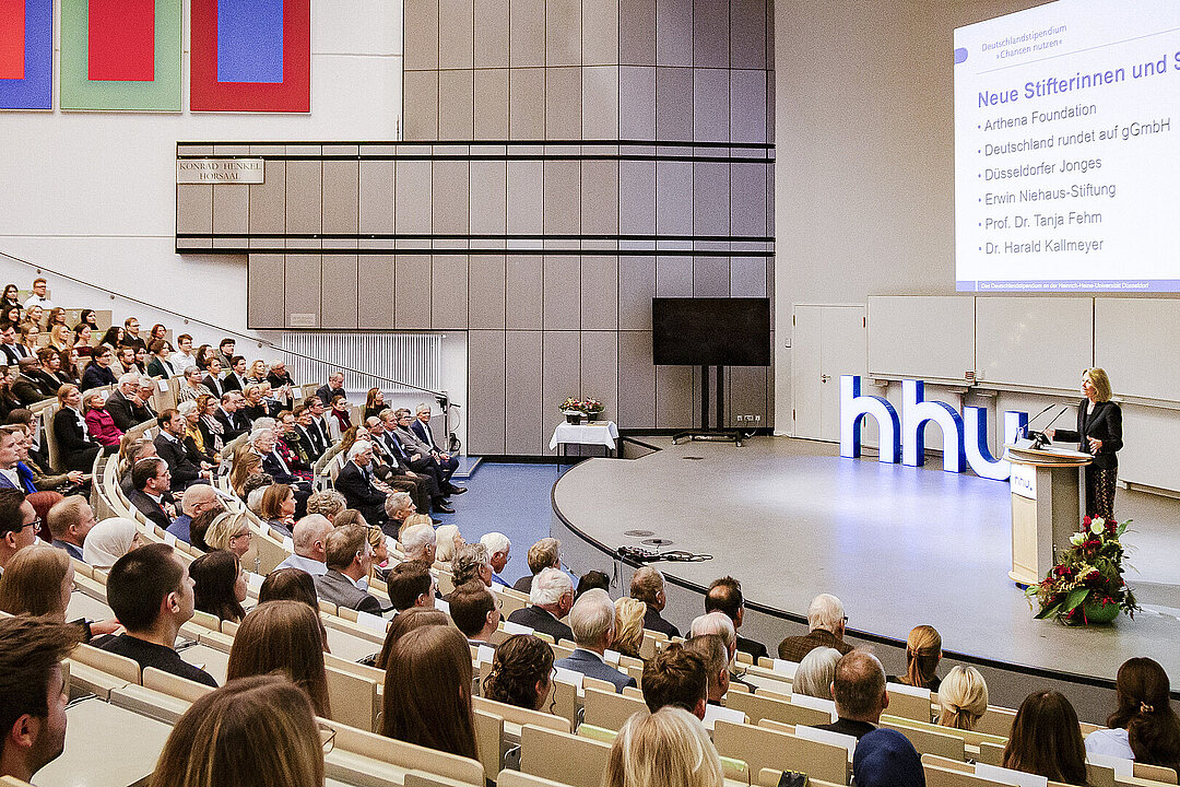 Bei der feierlichen Übergabe der Stipendienurkunden am 11. Dezember würdigte Rektorin Prof. Dr. Anja Steinbeck das Engagement der Stifterinnen und Stifter: „Ihre große Bereitschaft, auch über Jahre hinweg zu fördern, macht unser Programm »Chancen nutzen« erst möglich. Dass die HHU nun schon im vierten Jahr in Folge bei der Anzahl der vergebenen Deutschlandstipendien an der Spitze der nordrhein-westfälischen Hochschulen steht, ist ganz besonders Ihnen zu verdanken!“.