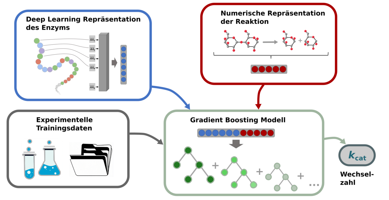 Um ein kcat -Vorhersagemodell zu trainieren, wurden mithilfe von Deep Learning-Modellen Informationen über die Enzyme und die katalysierten Reaktionen in numerische Vektoren umgewandelt. Diese numerischen Vektoren dienten als Eingabe eines Machine Learning-Modells – eines sogenannten Gradient Boosting-Modells –, das die kcat -Werte vorhersagt.