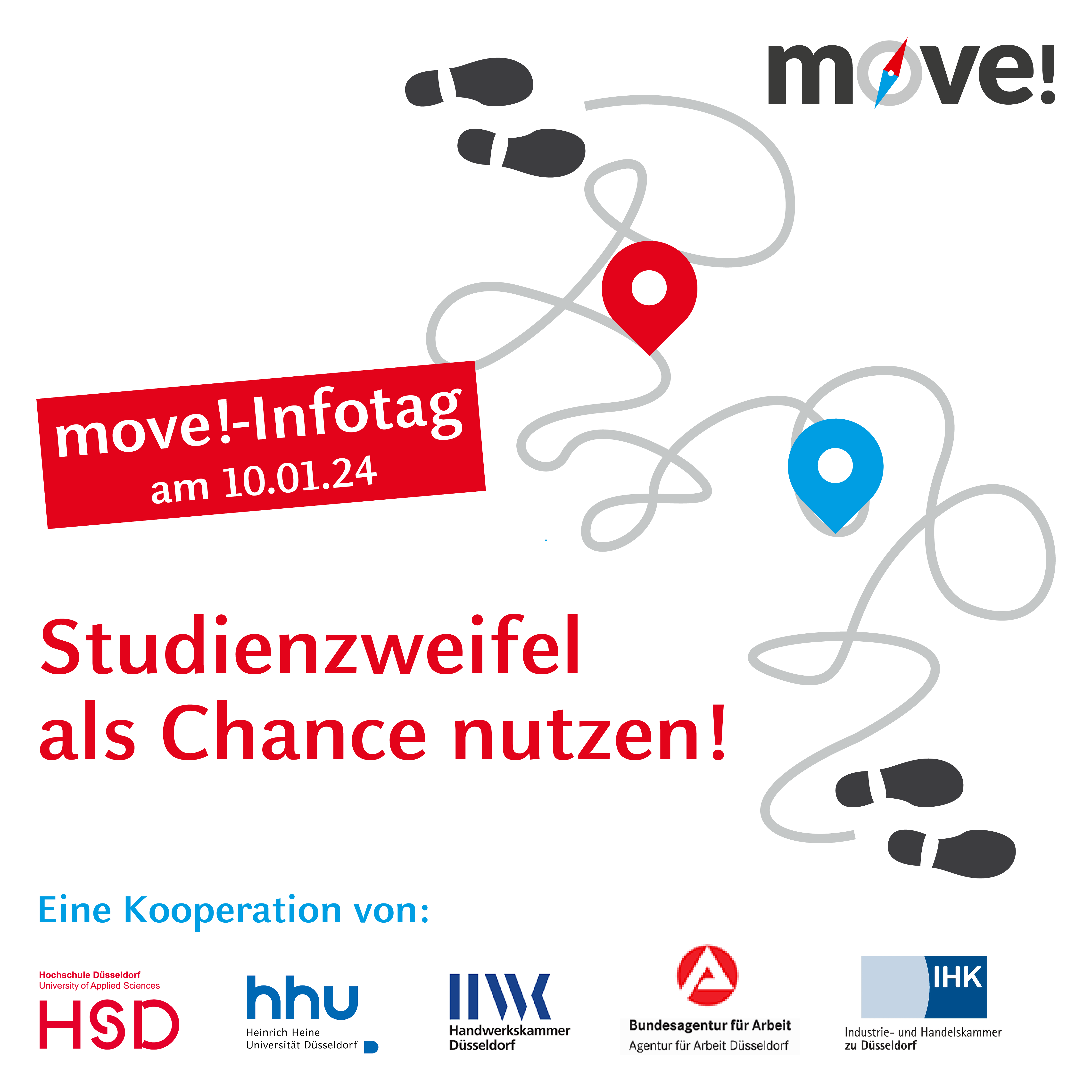 Am Mittwoch, dem 10. Januar 2023, findet die Infomesse „move!“ auf dem HHU-Campus statt. Um mögliche nächste Schritte zu beleuchten, stehen wie gewohnt zum Gespräch bereit: Ansprechpartnerinnen und Ansprechpartner der Studienberatungen und Career Services von Heinrich-Heine-Universität Düsseldorf und Hochschule Düsseldorf (HSD), der Arbeitsagentur Düsseldorf, der Handwerkskammer Düsseldorf, der Industrie- und Handelskammer zu Düsseldorf sowie der Finanzierungsberatung des Studierendenwerks. Auch ehemalige Studierende, die ihre Zweifel als Impuls für einen Neustart genutzt haben, stehen vor Ort für einen Austausch zur Verfügung. Außerdem nimmt eine Podiumsdiskussion zu Beginn „Fragen und Irrtümer rund um Studienzweifel“ in den Fokus.
