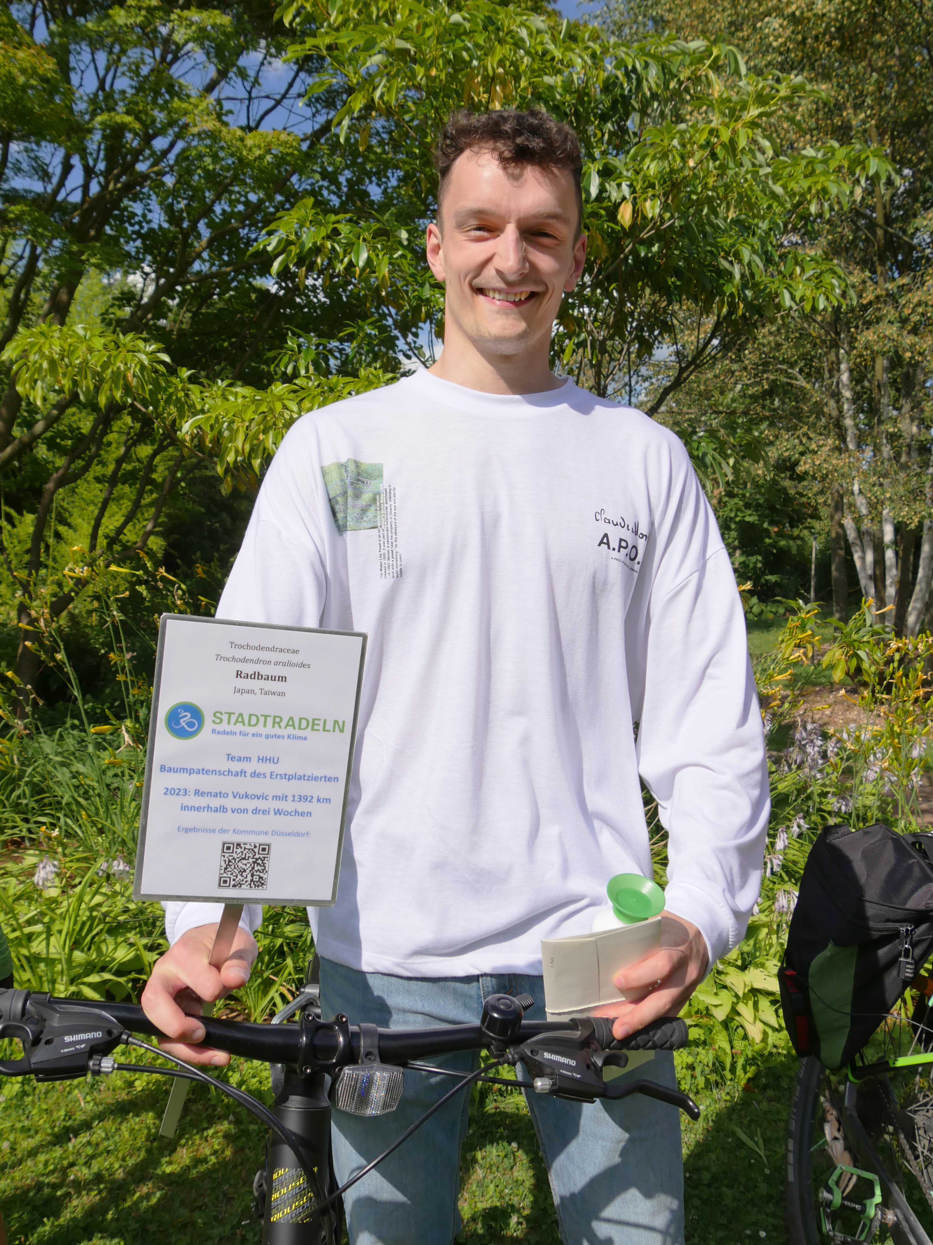 „Großartig, dass so viele HHU-Mitglieder mitgemacht haben – wird freuen uns schon aufs Stadtradeln 2024“, sagt Teamleiterin Lara Müller. Am 12. Juli wurde bei einem Fototermin die Baumpatenschaft aktiviert, die für ein Jahr gilt.