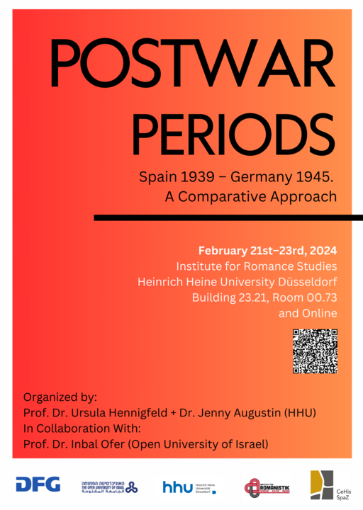 Den Auftakt des Projekts bildet die internationale Fachtagung „Postwar Periods“, die vom 21.-23.2.2024 an der Heinrich-Heine-Universität Düsseldorf (in Präsenz und online) stattfindet. Arbeitssprachen der Tagung sind Englisch und Spanisch.