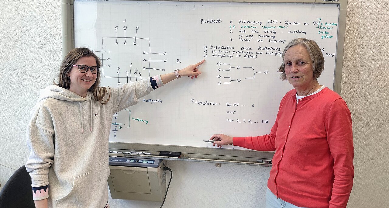 Um aus einer einfachen Verbindung zwischen zwei Punkten ein ganzes Netzwerk entstehen zu lassen, braucht es Knotenpunkte, die diese Quantenzustände zwischenspeichern und für die Übertragung zum nächsten Knoten sorgen – eben die Quantenrepeater. Prof. Becher weiter: „Wir möchten zwischen zwei Endpunkten einer Netzwerkverbindung Zwischenknoten einrichten, an diesen Knoten Quantenspeicher einbauen und Gatteroperationen durchführen. Das soll einen Quantenvorteil bei der Übertragung erzielen und die Fehlerkorrektur für leistungsstärkere Quantenrepeater-Protokolle ermöglichen“.