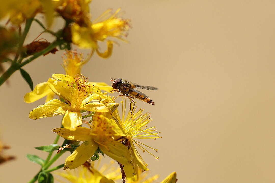 Der Einsender des schönsten Fotos – einer Hainschwebfliege (Episyrphus balteatus) im Landeanflug auf die Blüte eines Echten Johanniskrauts (Hypericum perforatum) – wird mit einer Baumpatenschaft belohnt. Er ist nun Pate einer wilden Kiefern-Hybride, die sich selbst im Bereich „Moorlandschaft“ – der zukünftig neugestaltet wird – angesiedelt hat.