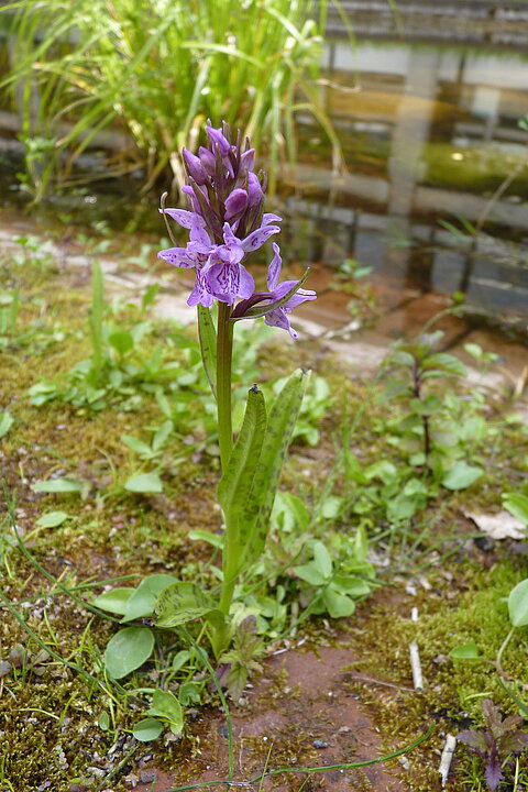 Klein sind sie und hübsch anzusehen, die lila Blüten des „Gefleckten Knabenkrauts“ (Dactylorhiza maculata); eine Artengruppe, die in Deutschland besonders geschützt ist. Auf dem HHU-Campus wachsen sie in den Pflasterritzen bei der Teichanlage im Bereich der Pharmazie, zwischen den Gebäudetrakten 26.22/.23 und 26.32/.33.