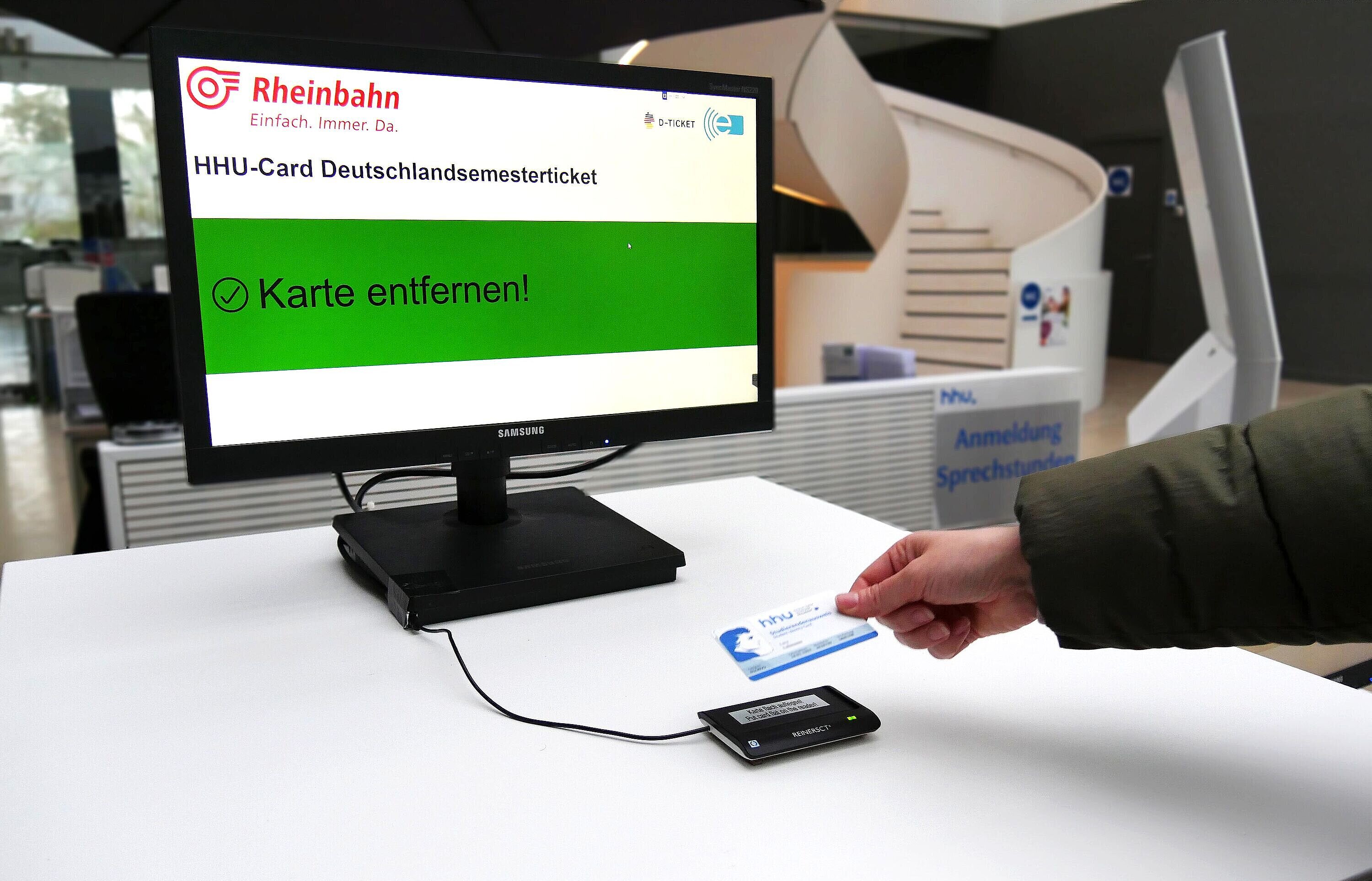 Die HHU-Card, also der Studierendenausweis, wird im SSC, dem Studierenden Service Center, und in der ULB, der Universitäts- und Landesbibliothek, neu programmiert. Das dauert nur wenige Sekunden und man legt dafür die Karte einfach selbst auf das entsprechende Gerät. Bis Ende Mai geht das zu den regulären Öffnungszeiten (SSC: Mo-Fr, 9-15 Uhr, ULB: Mo-Fr, 8-22 Uhr, Sa/So, 10-21 Uhr).