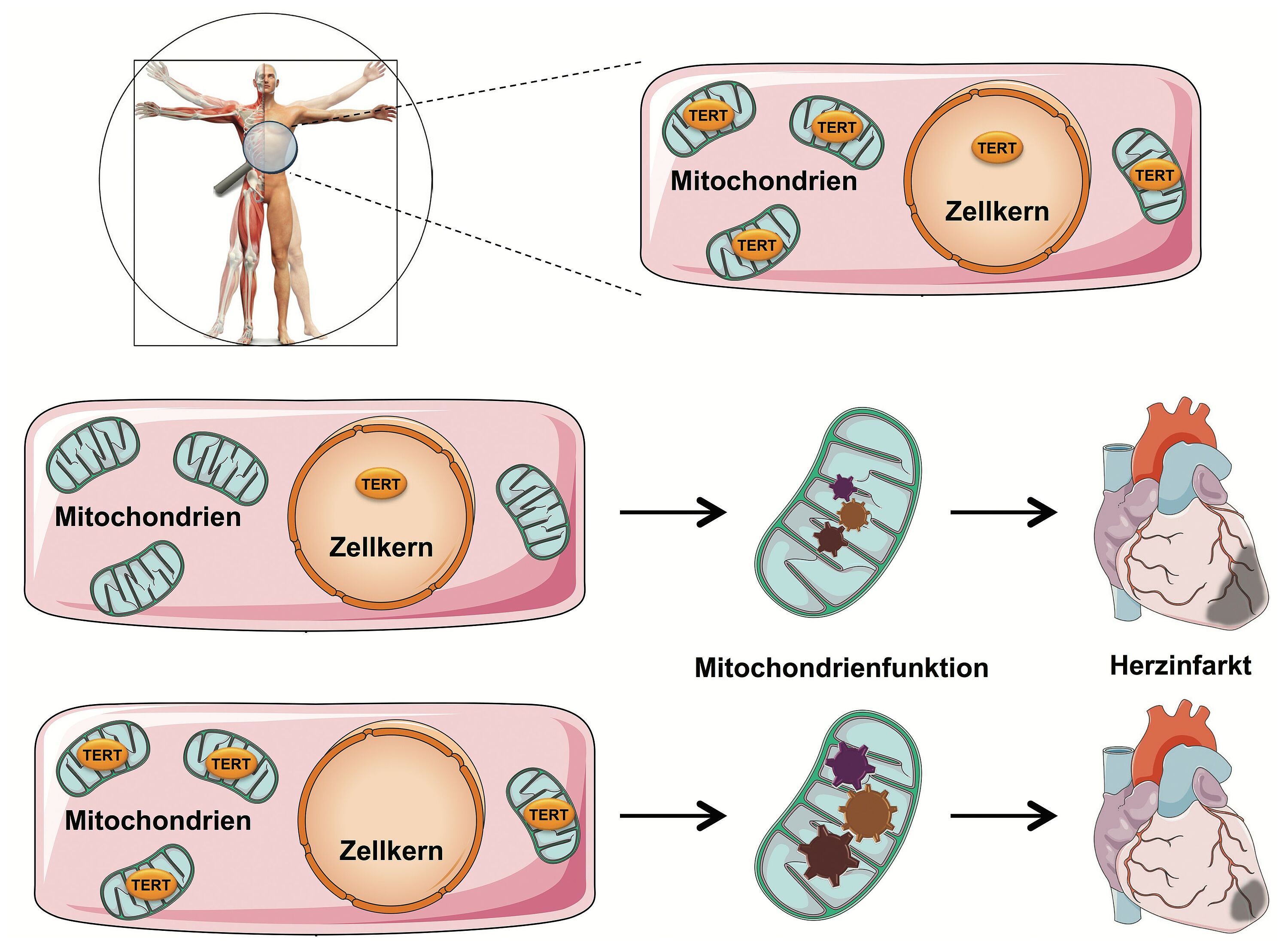 Hierfür haben Prof. Haendeler und Prof. Altschmied einzigartige Mausmodelle erzeugt, in denen das Protein in allen Körperzellen entweder ausschließlich im Zellkern oder in den Mitochondrien vorhanden ist. So konnten sie nachweisen, dass mitochondriale, nicht aber nukleäre TERT (im Zellkern) die Mitochondrienfunktion im Herz verbessert und das geschädigte Areal nach einem Herzinfarkt verkleinert.