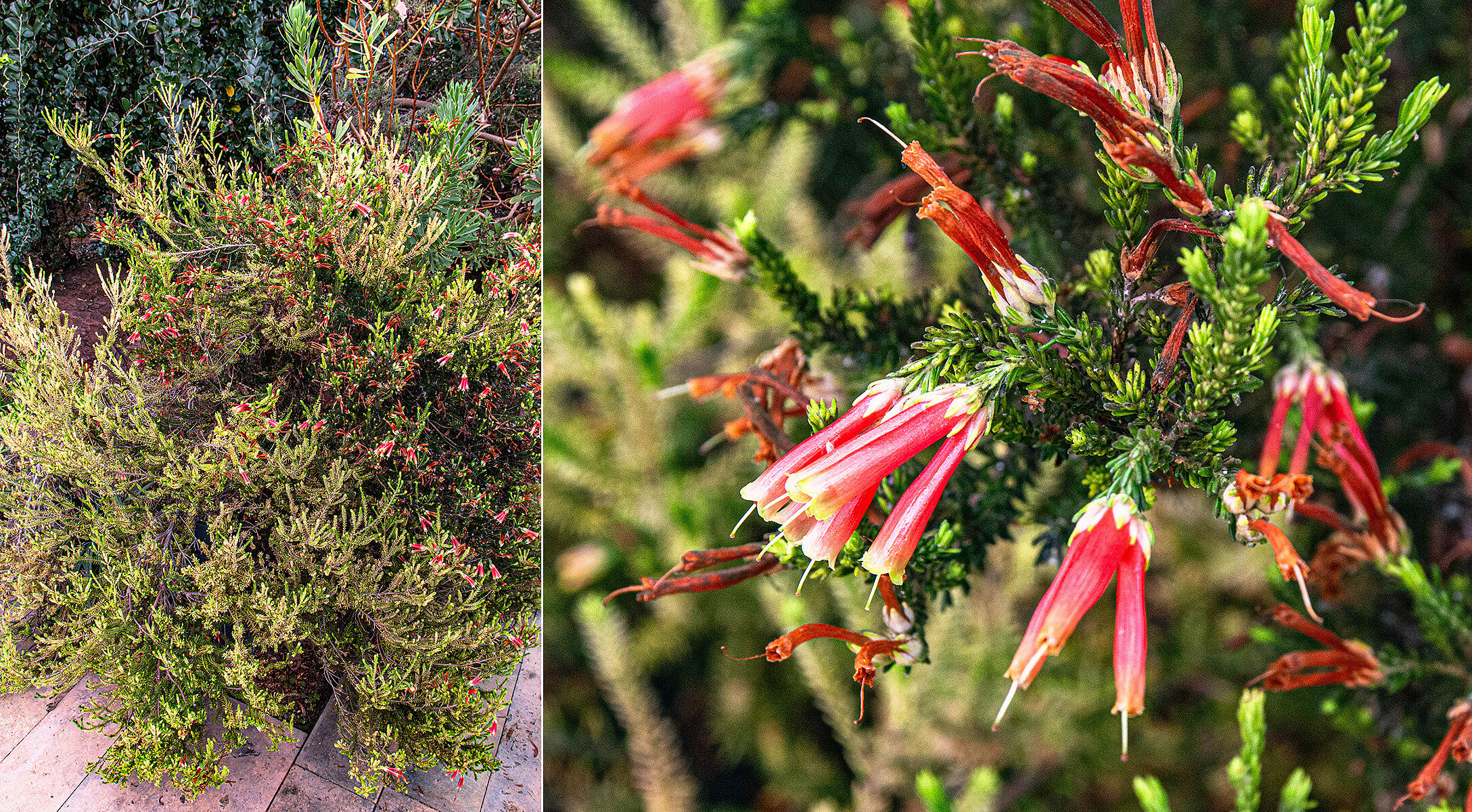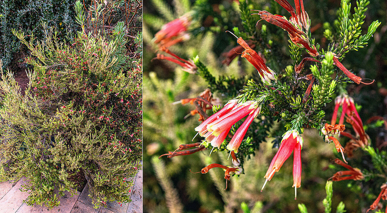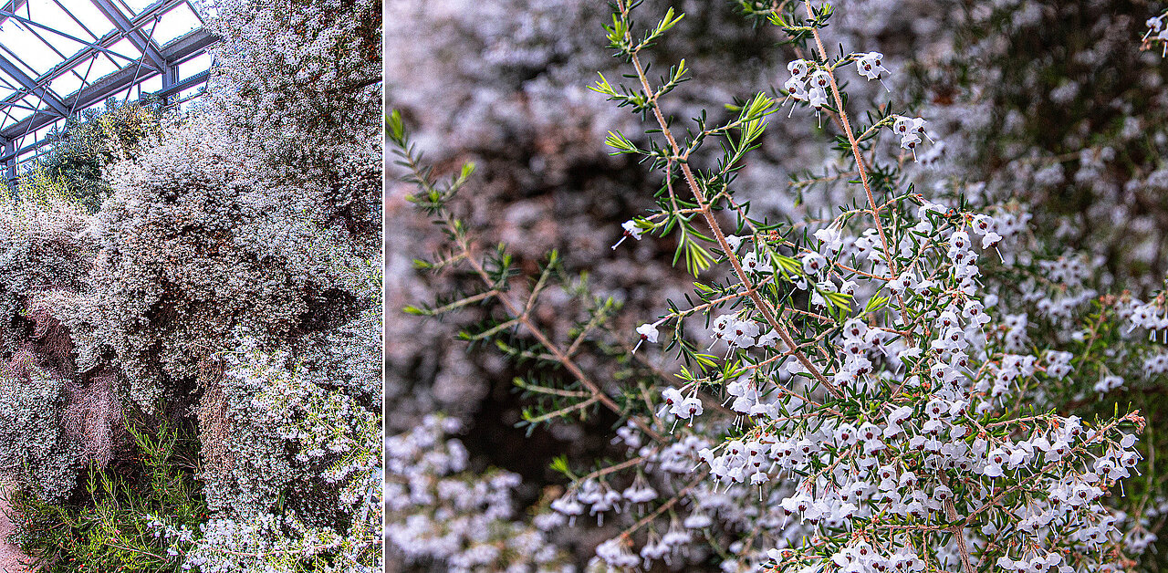 Eine weitere Besonderheit der Kapregion sind die Heidepflanzen (Erica). Während diese in Deutschland vor allem bodennah zwergstrauchig wachsen, bilden sie in Südafrika hohe Sträucher oder sind sogar baumartig. Im Botanischen Garten wächst üppig die strahlendweiß blühende Erica canaliculata ‚Mrs. D.F. Maxwell‘ als breite, über drei Meter hohe Hecke sowie Erica versicolor mit ihren markanten Blüten. Etges: „Die Heidepflanzen sind gut an die trockenen, heißen Standorte angepasst. So lassen ihre reduzierten Blätter kaum Transpiration zu.“ Neben Insekten dienen auch bei den südafrikanischen Eriken Vögel als Bestäuber.