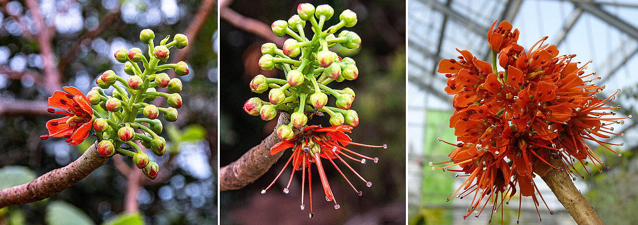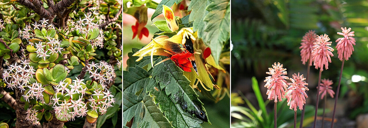 Besonders empfehlenswert ist aktuell der Weg ins Südafrikahaus, wo viele Pflanzen in Blüte stehen. Auf eine Besonderheit der südafrikanischen Pflanzen weist Sabine Etges hin: „Im Gegensatz zu unseren Gefilden dienen in Südafrika sehr oft Vögel als Bestäuber, die Blüten sind entsprechend dafür gebaut.“