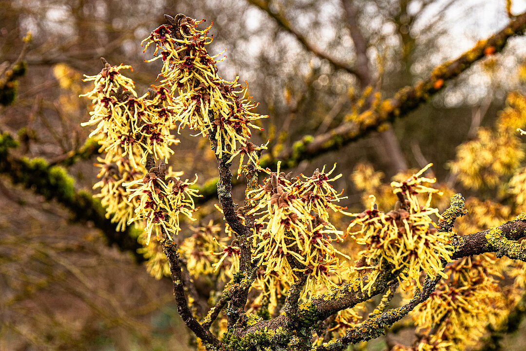 An vielen Bäumen findet sich ein Flechtenbewuchs, der einen zweiten Blick lohnt. Etges sagt: „Flechten sind Organismen aus Pilzen und Grünalgen oder photosynthesetreibenden Bakterien, die in Symbiose leben.“ Die gelbe Flechte Xanthoria parietina bildet kleine runde Scheiben. Dies sind die Fruchtkörper (Apothecien) des Pilzes, in denen er Sporen zur Verbreitung entwickelt. „Diese Flechtenart enthält Grünalgen, die die Fotosynthese leisten. Die gelbe Färbung beruht auf dem Pigment Parietin, das auch als Sonnenschutz dient“, so Etges beim Blick auf die Äste einer kleinen Magnolie.