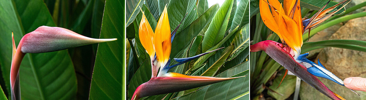 Eindrucksvoll sieht man dies an der Paradiesvogelblume (Strelitzia reginae): Deren markant geformte große Blüten besitzen ein spezielles blaues Blatt, das sich öffnet und die Bestäubungsorgane freigibt, sobald sich ein Vogel darauf niederlässt. Während er Nektar trinkt, setzen sich die Pollen im Gefieder fest und werden so zur nächsten Blüte getragen.