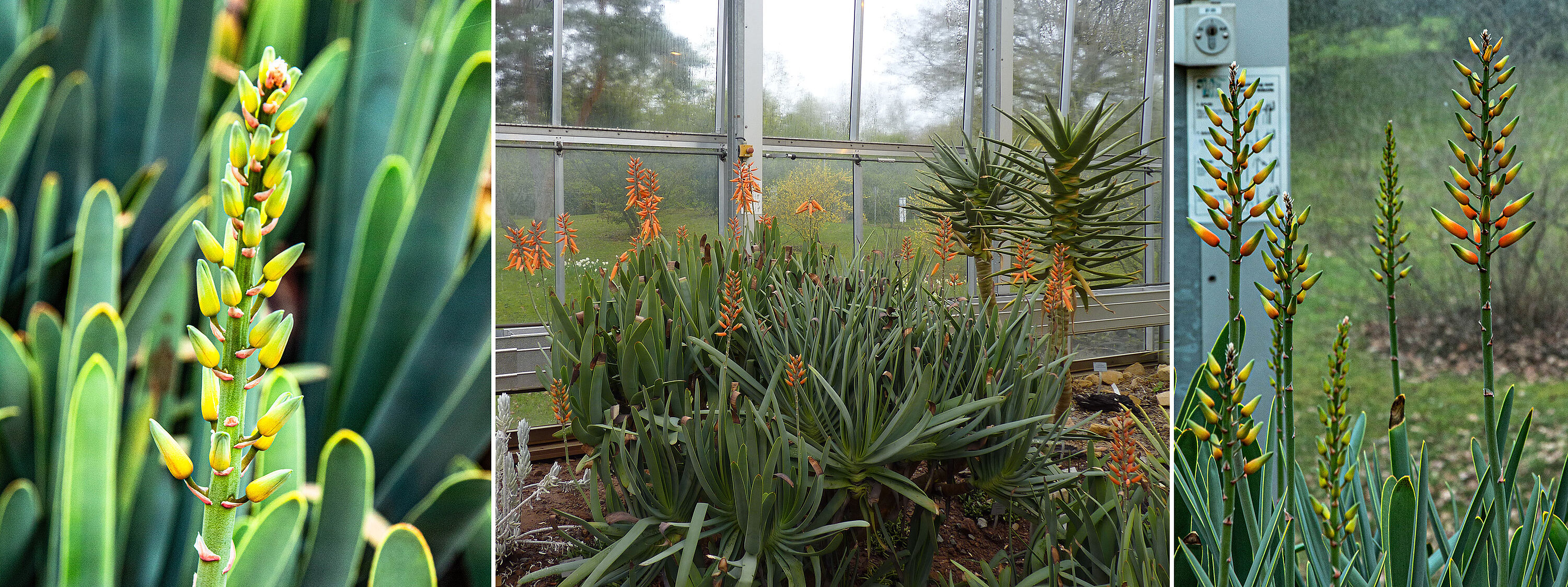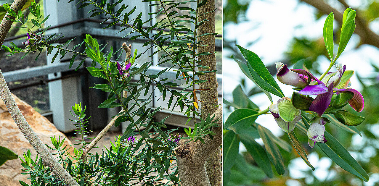 Weitere Vertreter der vogelbestäubten Pflanzen sind Greyia sutherlandii und die Aloe (Aloe plicatilis). Diese Aloe-Art mit ihren markanten Blütenständen stammt aus der Kapregion Südafrikas und wächst dort nur in einem sehr kleinen Gebiet, „sie ist eine botanische Rarität“, wie Etges betont.